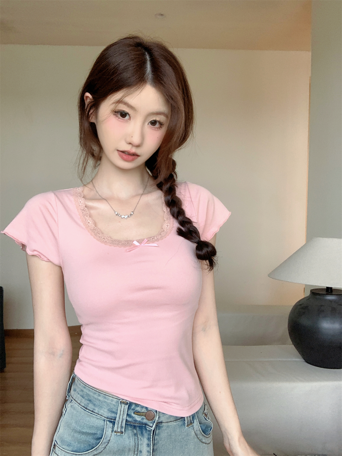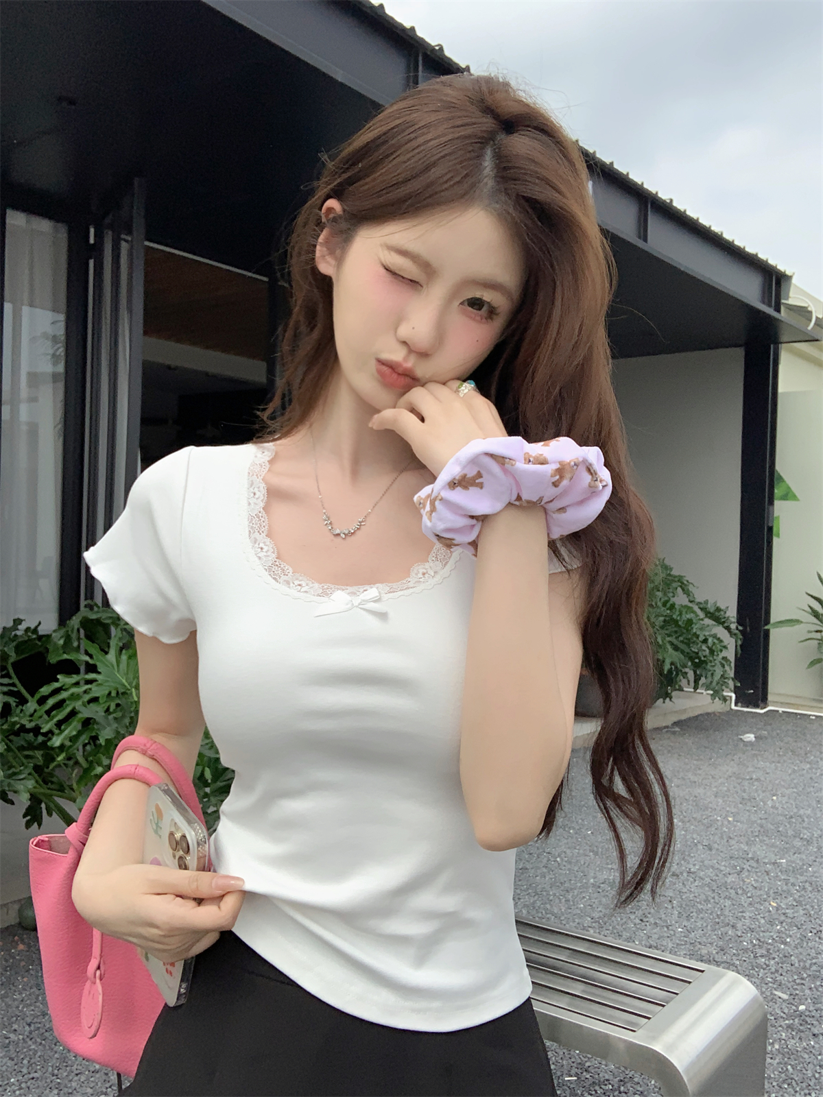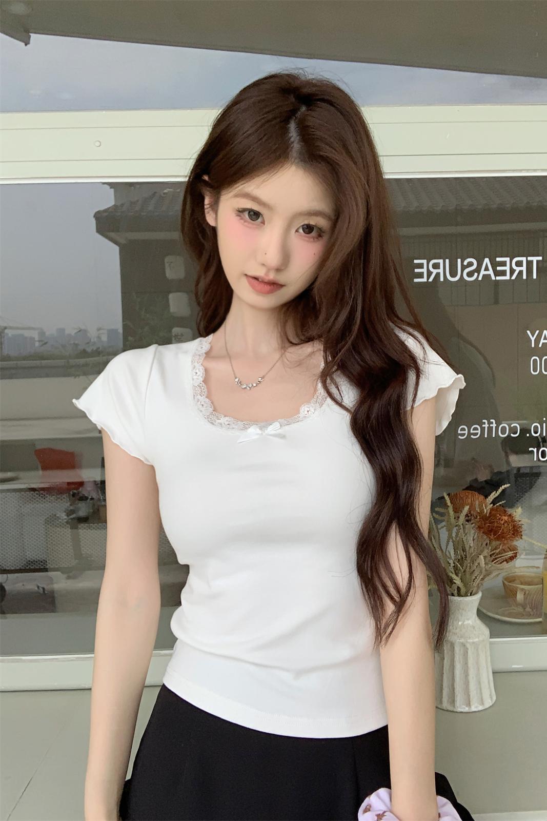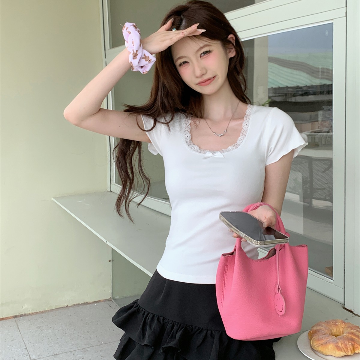 여름 한국어 버전 슬림 U-넥 간단한 주름 순수면 조끼 티셔츠 여성을위한
