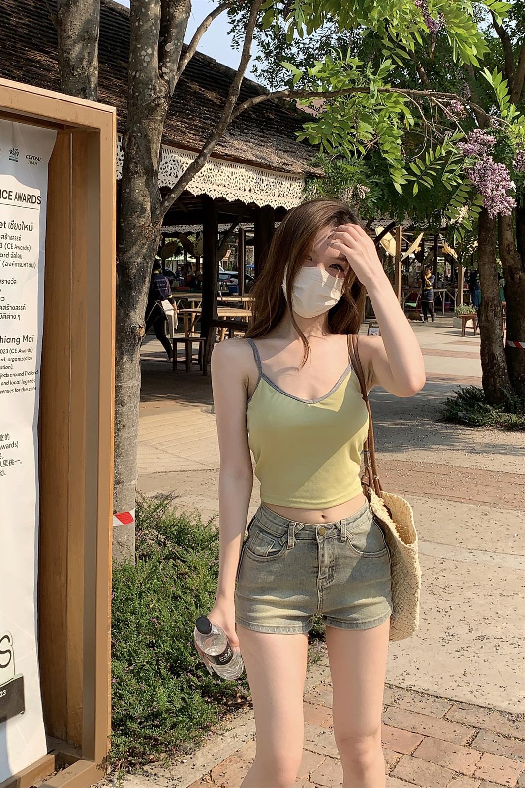 실제 사진 및 여름 한국 스타일 슬림 기질 U-Neck 다목적 주름 슬림면 조끼 티셔츠 여성을위한 탑