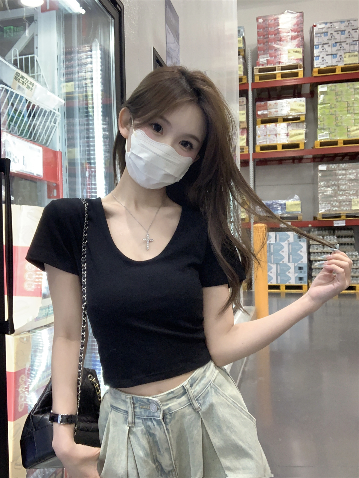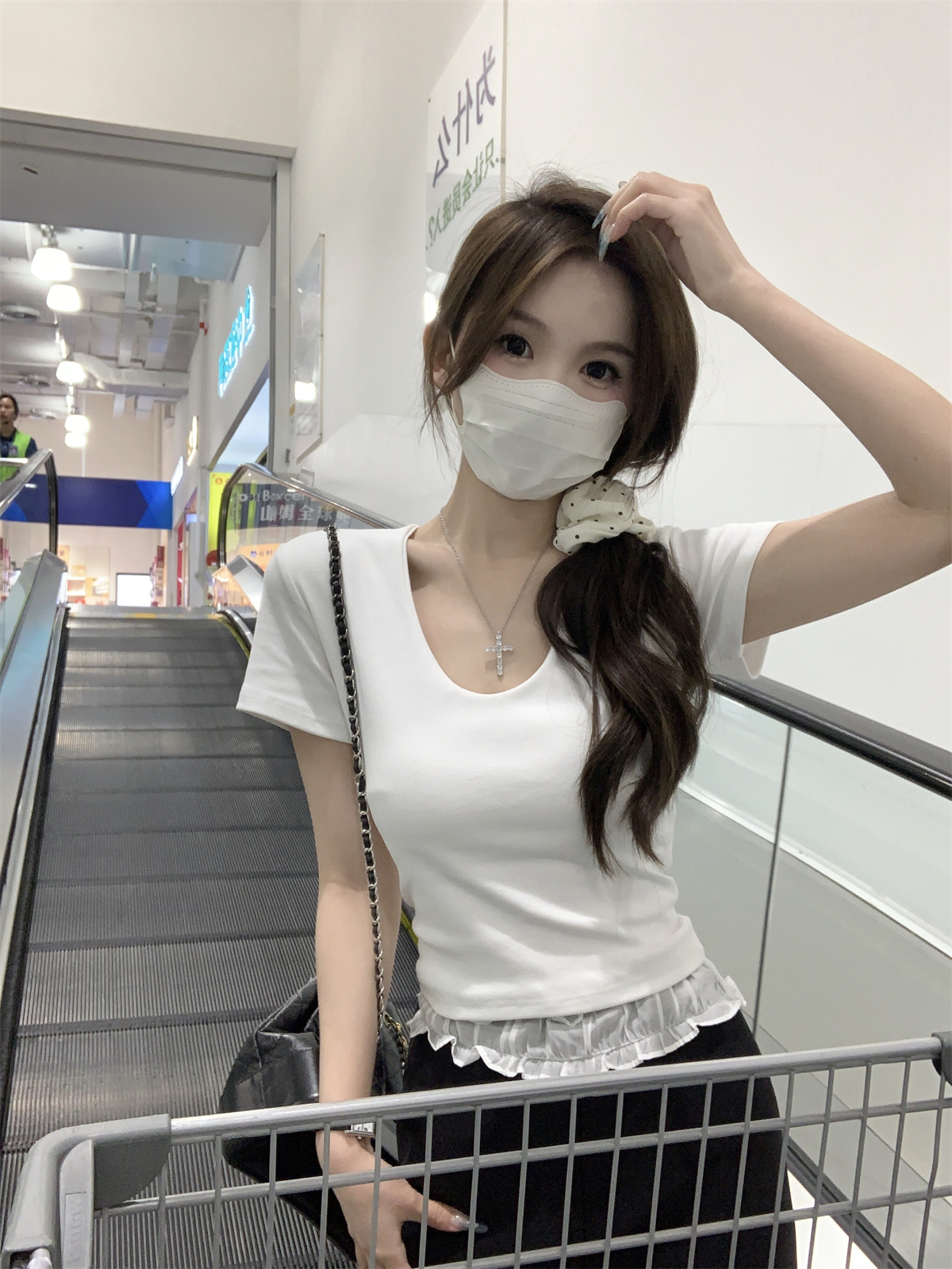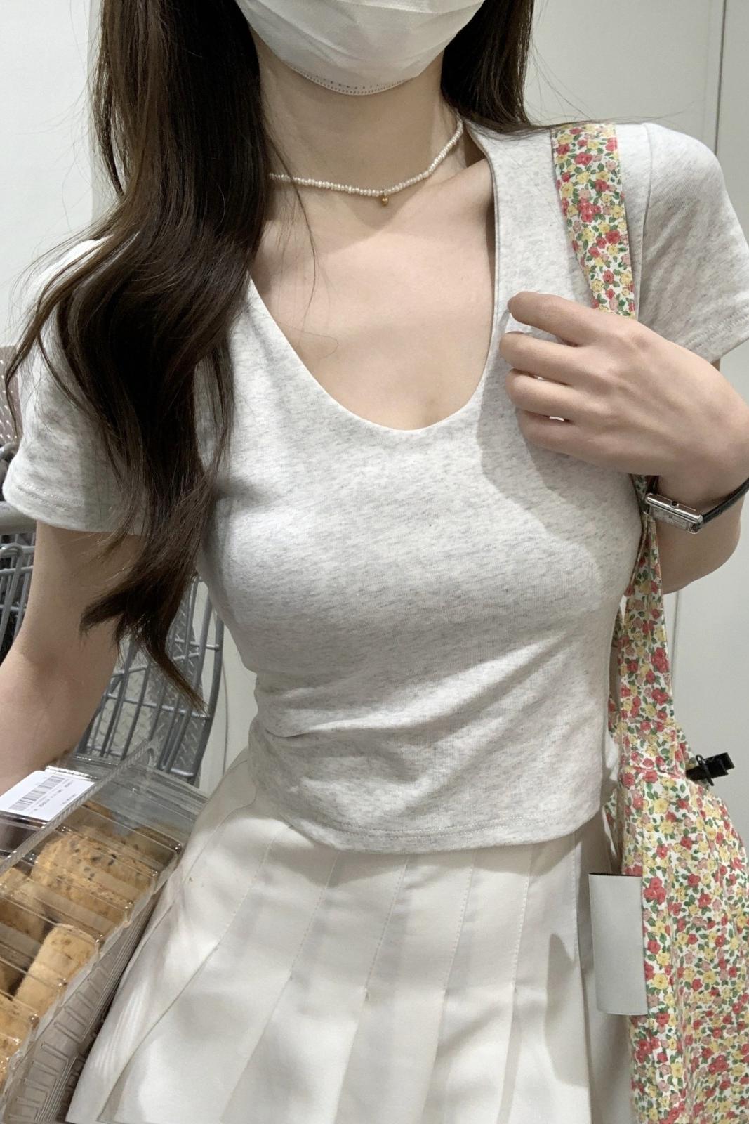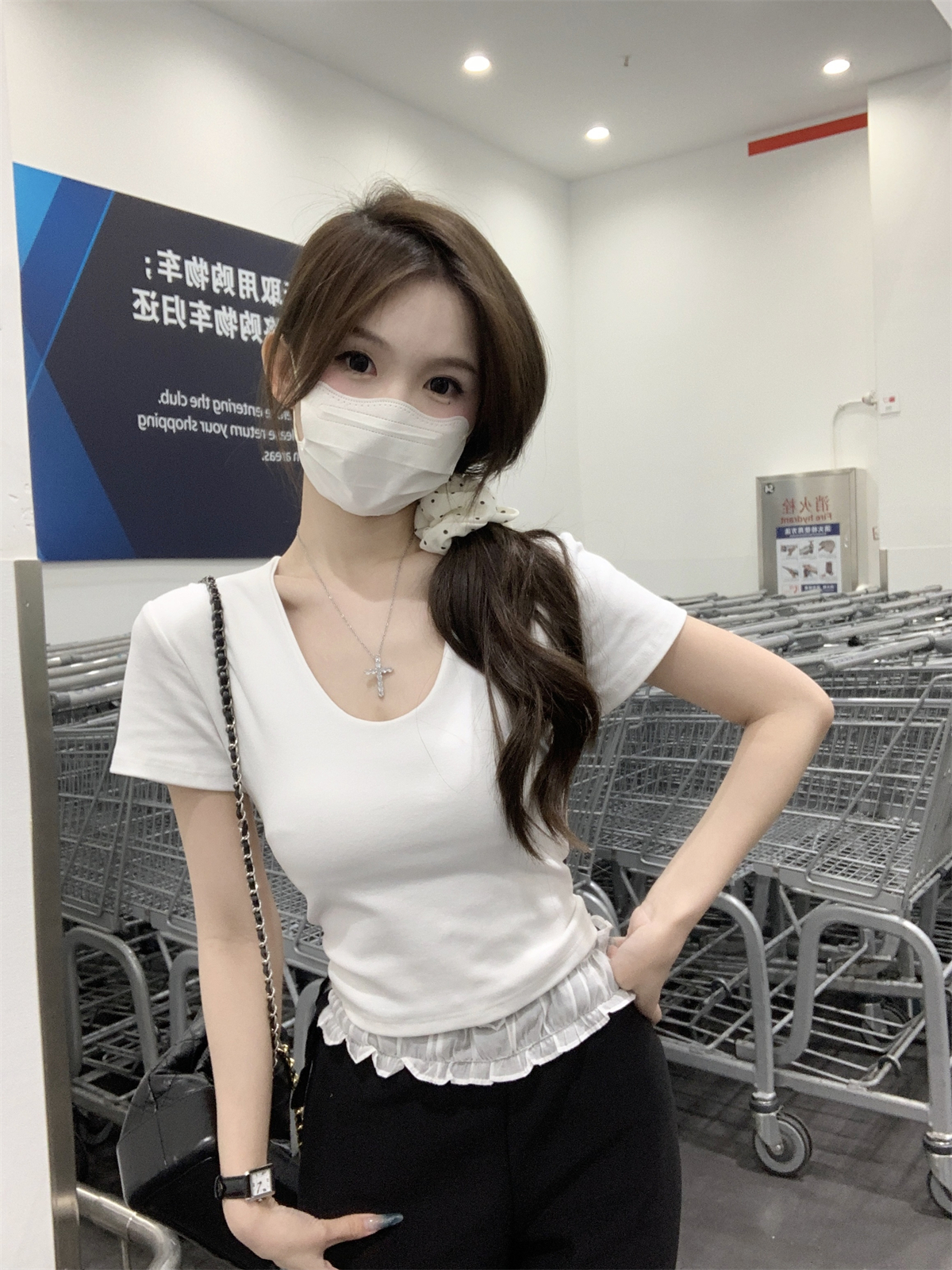 여름 한국 스타일 줄무늬 U-neck 주름 소매 6 개 니트 짧은 슬리브 여성 탑