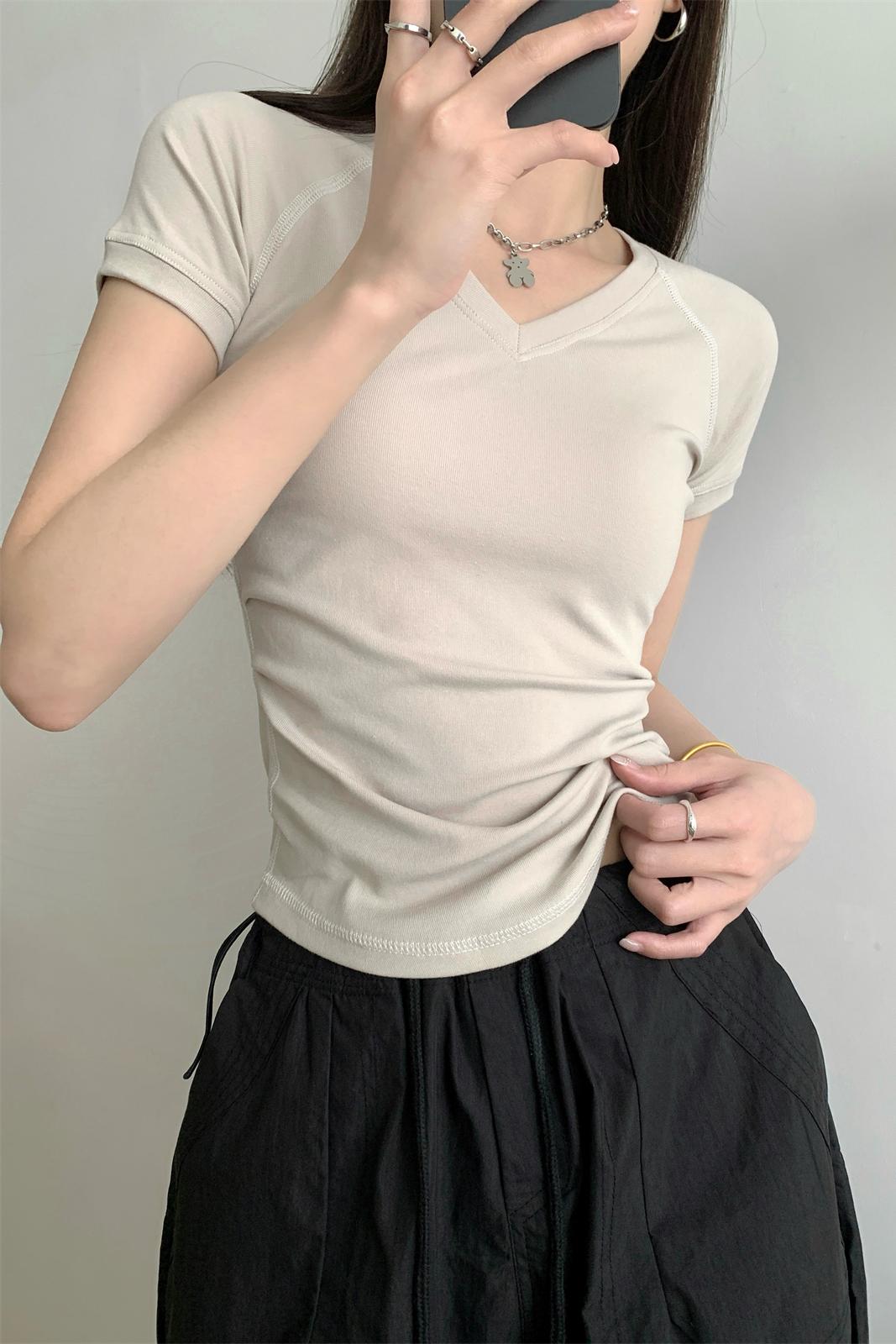 실제 사진 여름 라운드 목 기질 뼈 손톱 버튼 슬림 한 순수면 다목적 짧은 슬리브 티셔츠 여성을위한