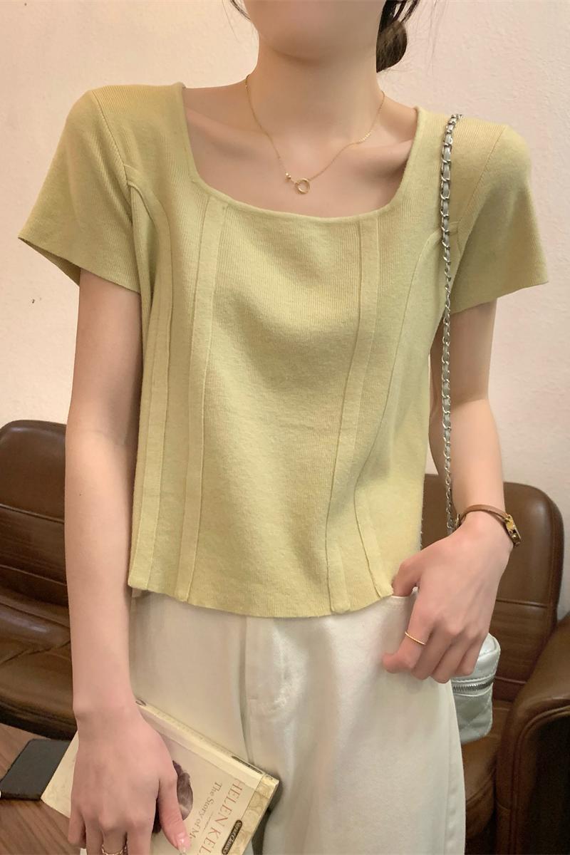 실제 사진 봄 여름 한국 스타일 스퀘어 칼라 주름 나무 귀걸이 벨 슬리브 6 양모 얇은 니트 긴팔 탑