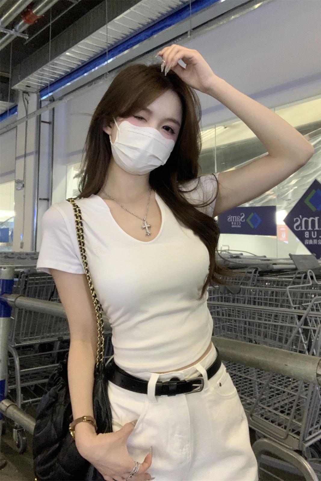 봄 여름 v- 넥 순수 슬림 순수 색상 가슴 패드 순수면 단락 티셔츠 여자 탑