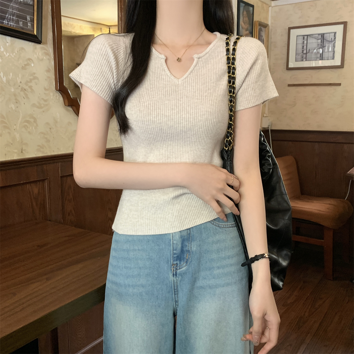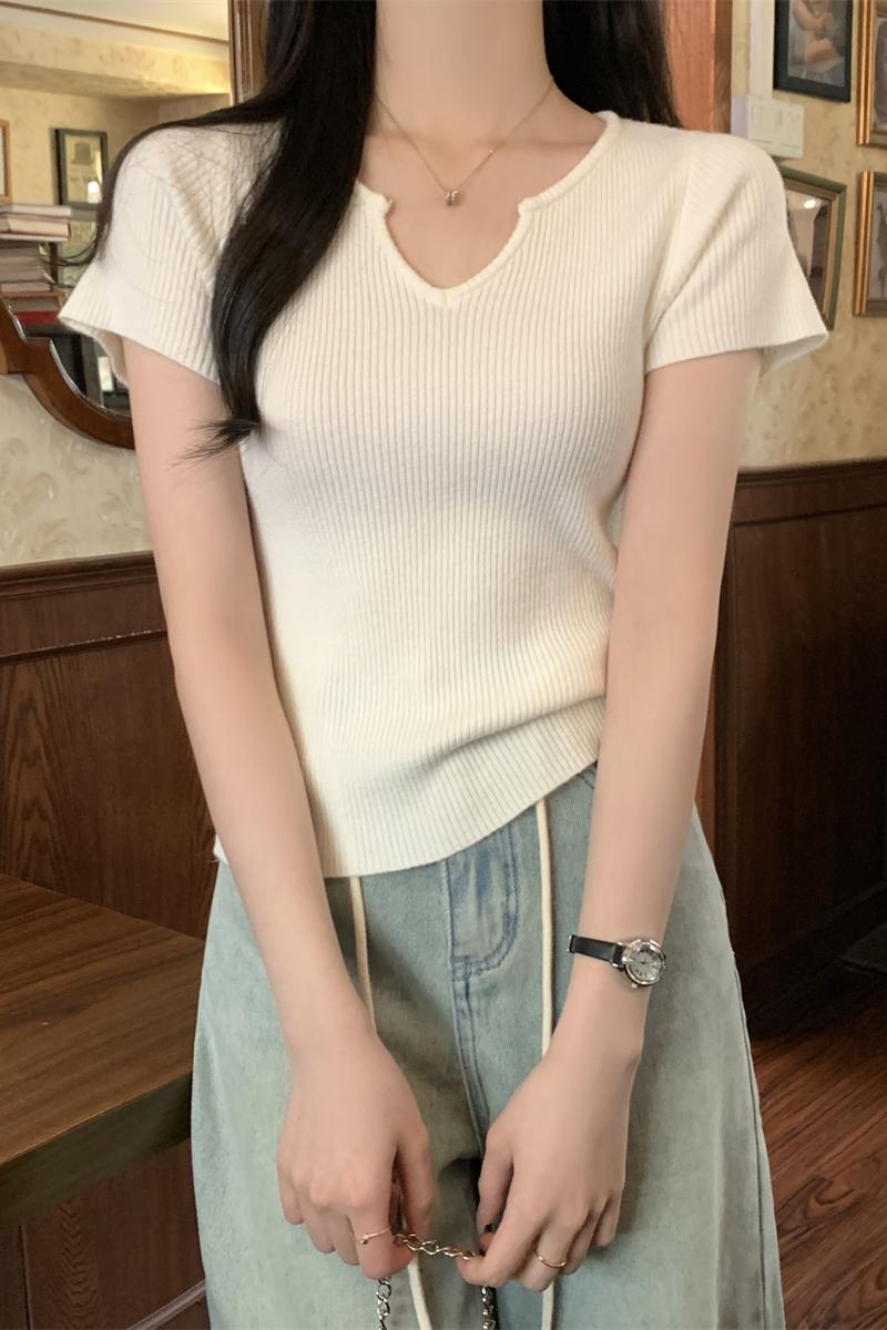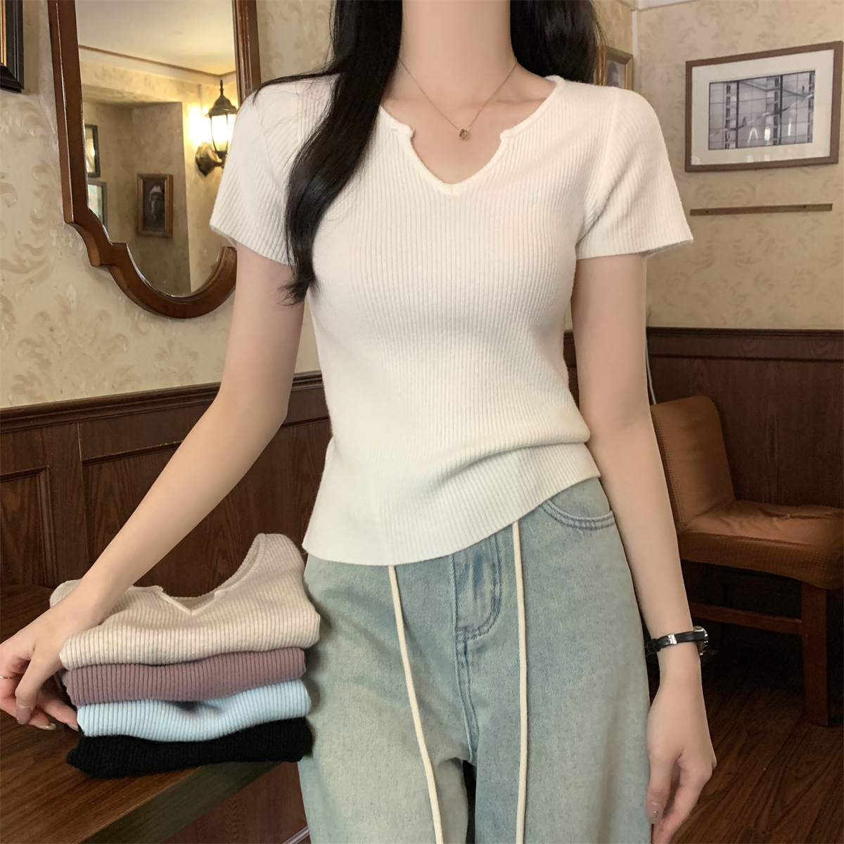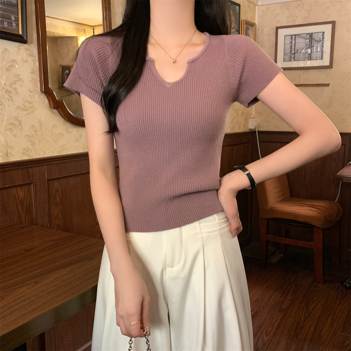 스프링 스프링 한국 스타일 슬림 정사각형 칼라 내부 짧은 상단 짧은 슬리브 여성을위한 다목적 스웨터