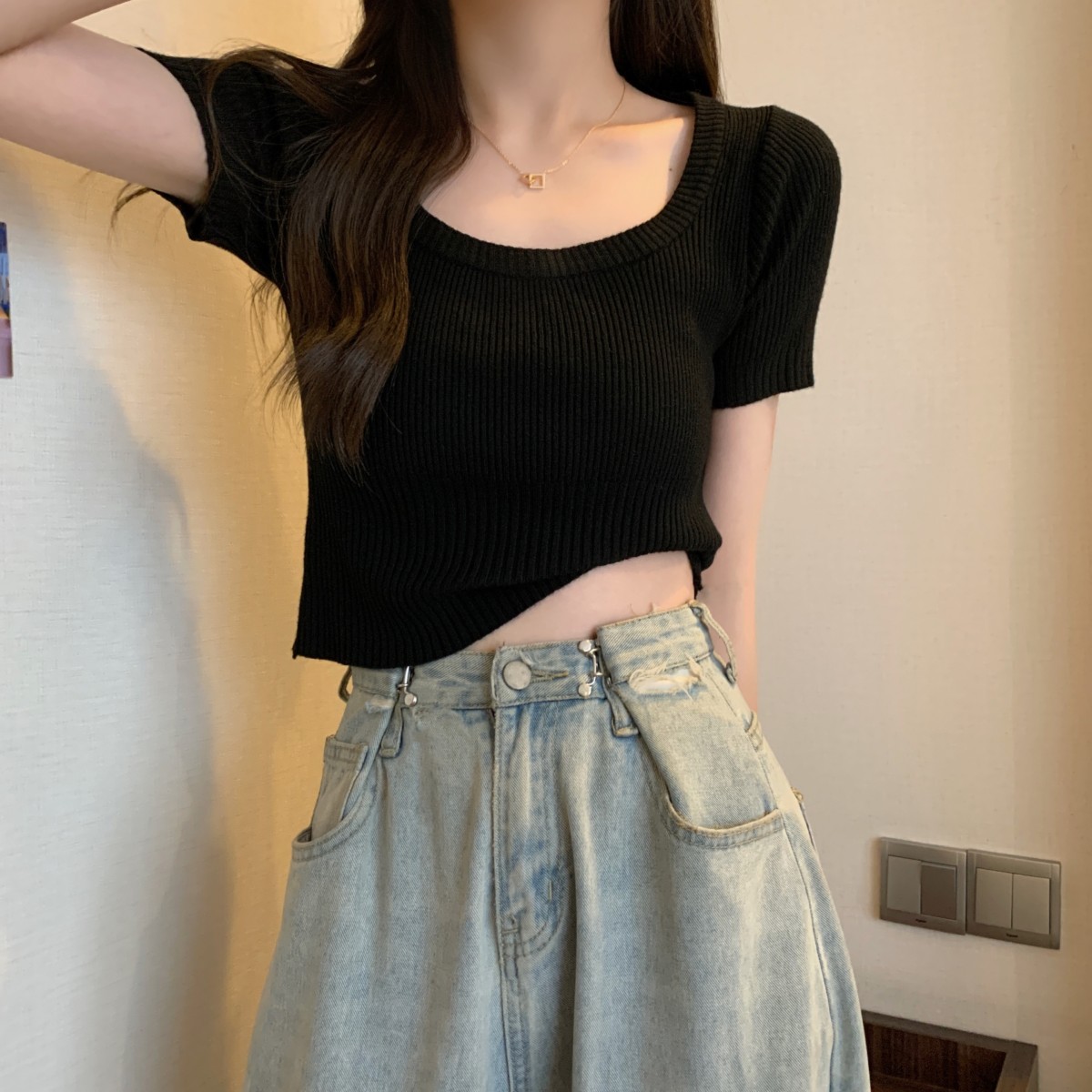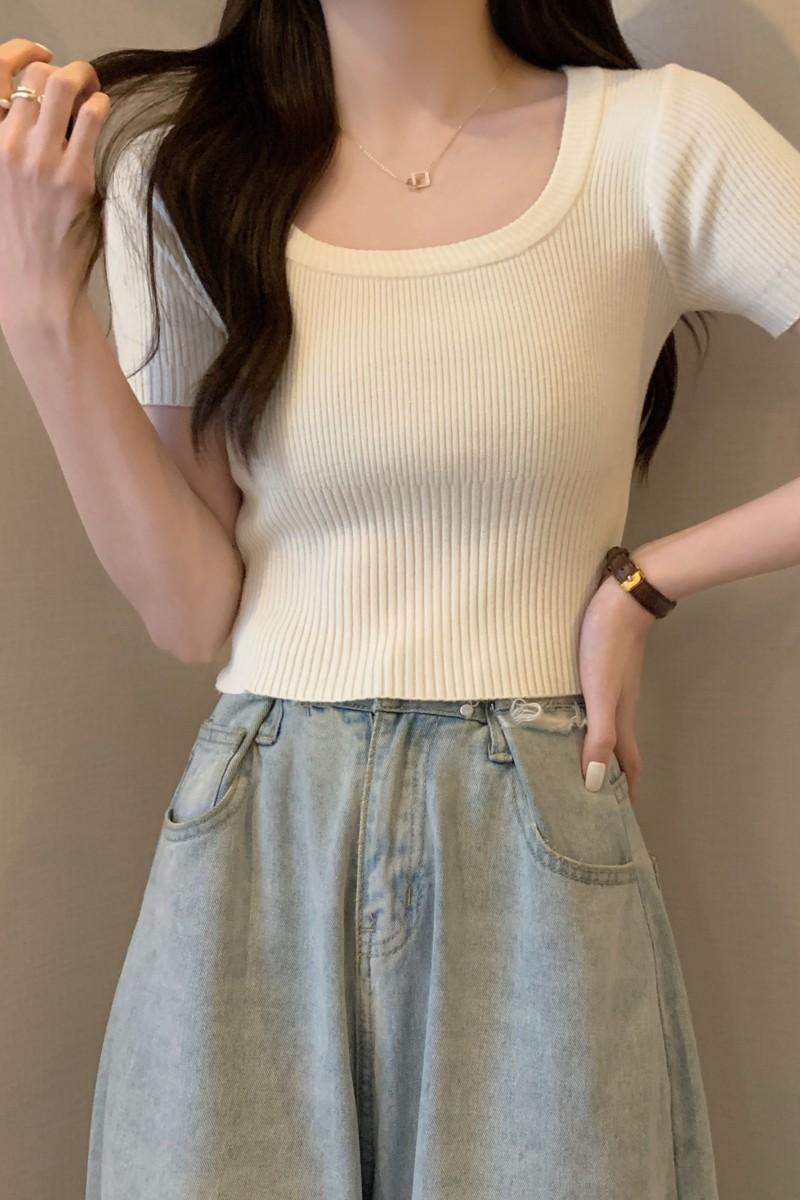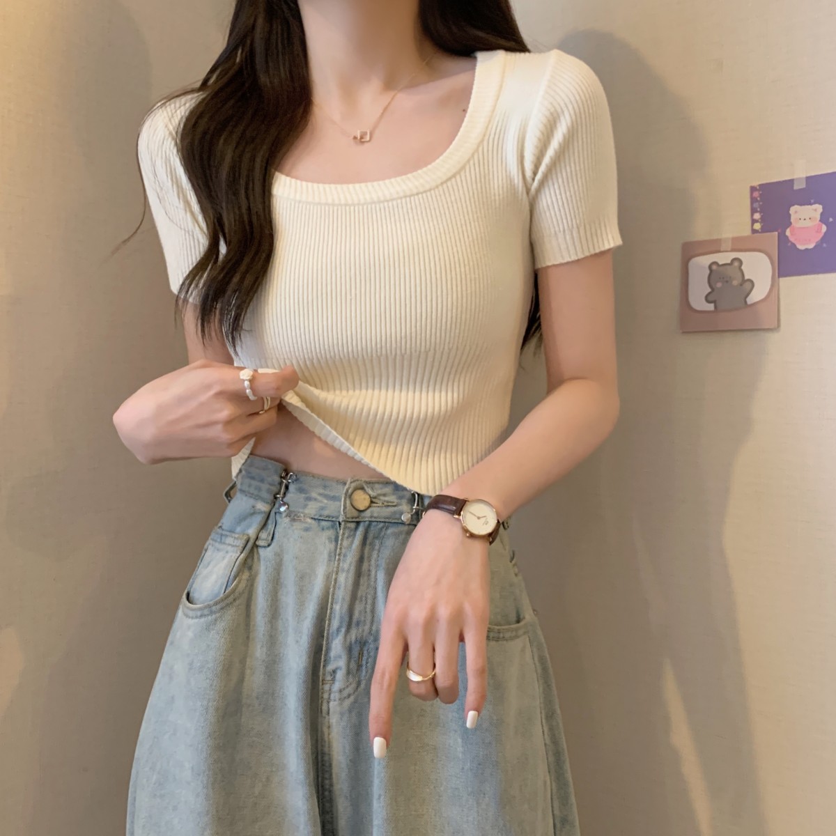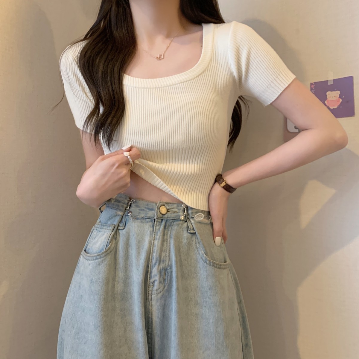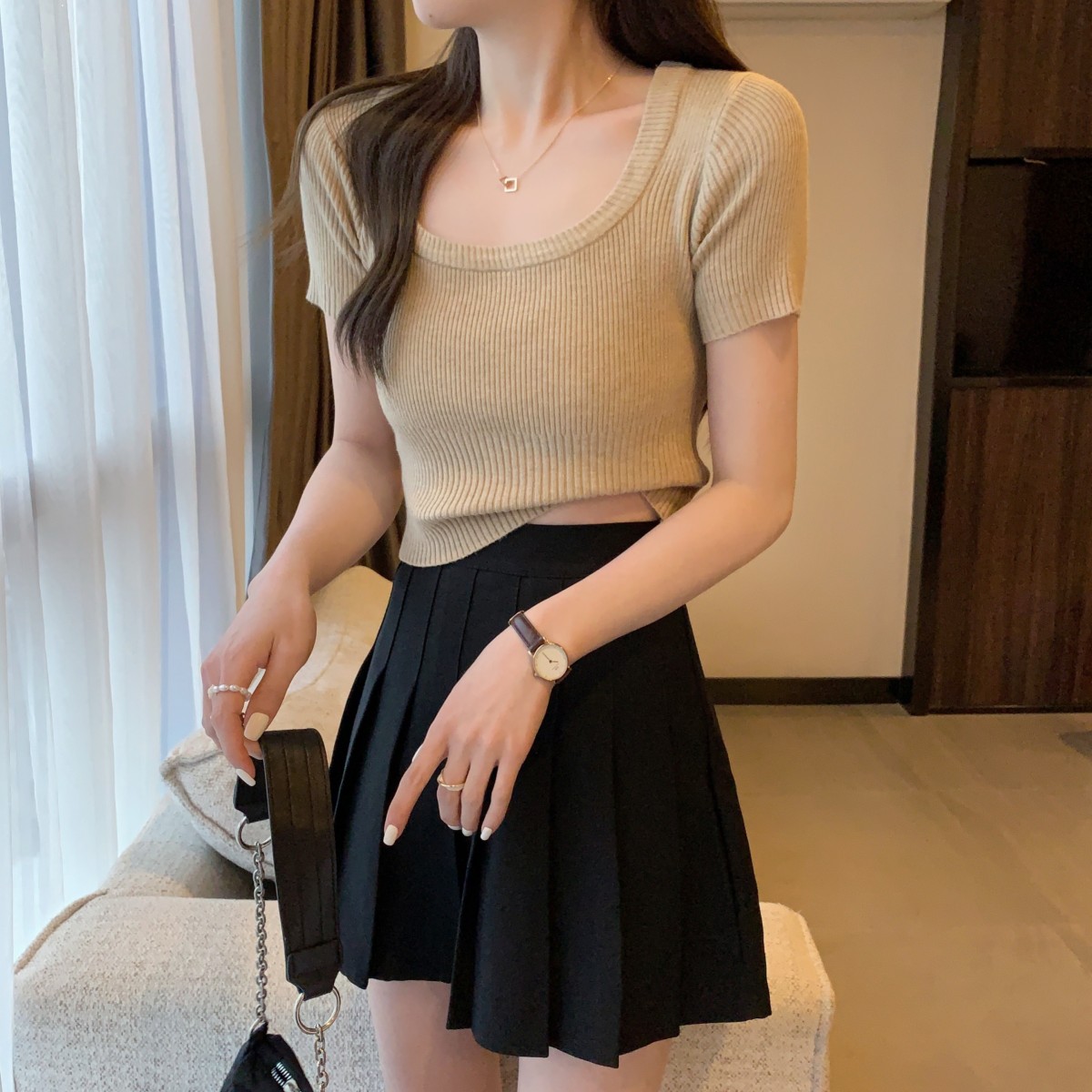봄 여름 한국 스타일 하프 오픈 칼라 단색 대용 앤디 벨벳 니트 짧은 슬리브 탑