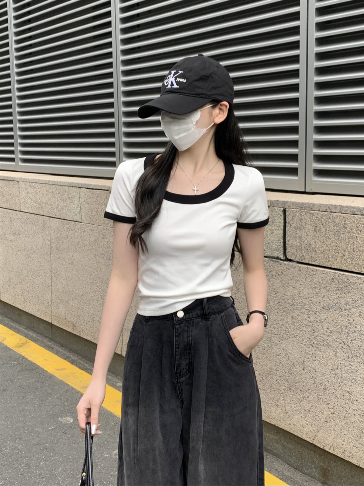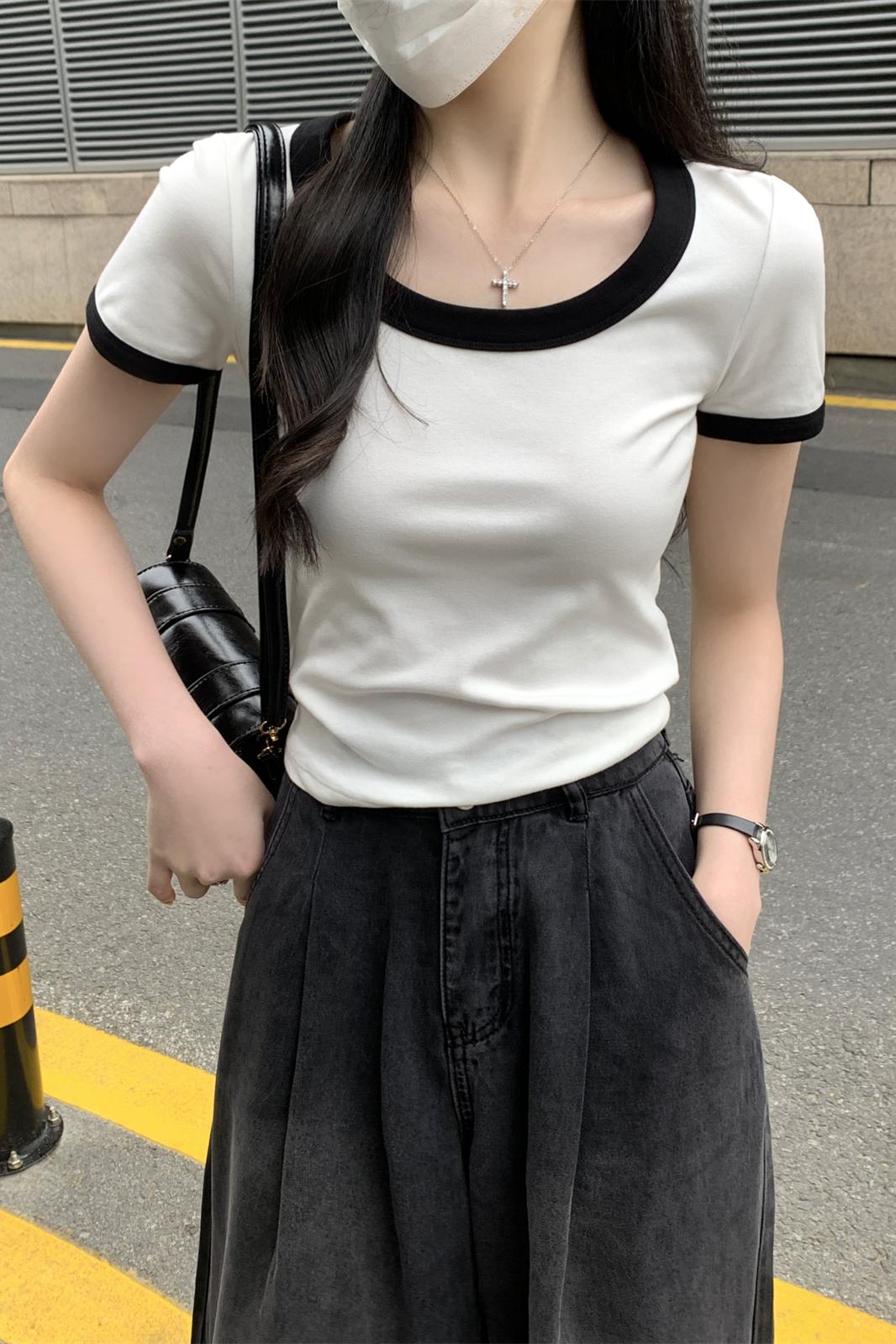봄 여름 라운드 넥 슬림 걸레 어깨 단색 기본적인 다목적 순수면 단락 상단 티셔츠