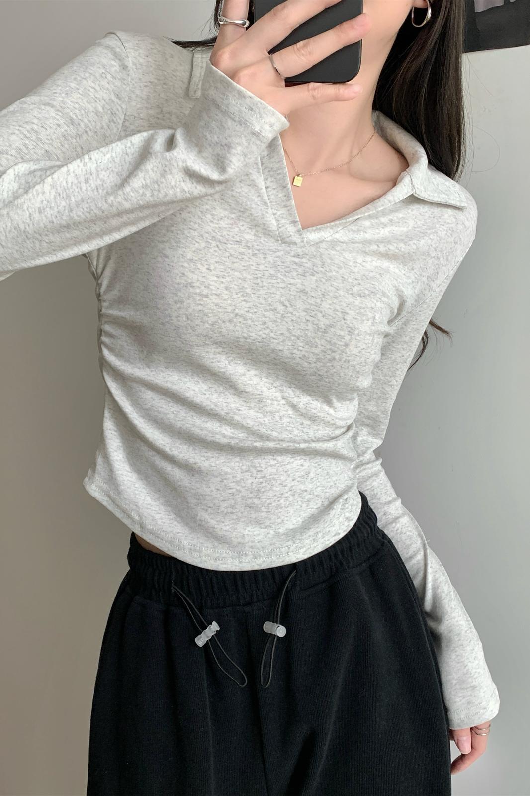 봄 여름 슬림 단색 다목적 어깨 주름 디자인 순수면 단락 티셔츠 탑
