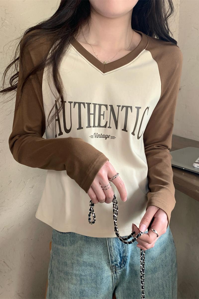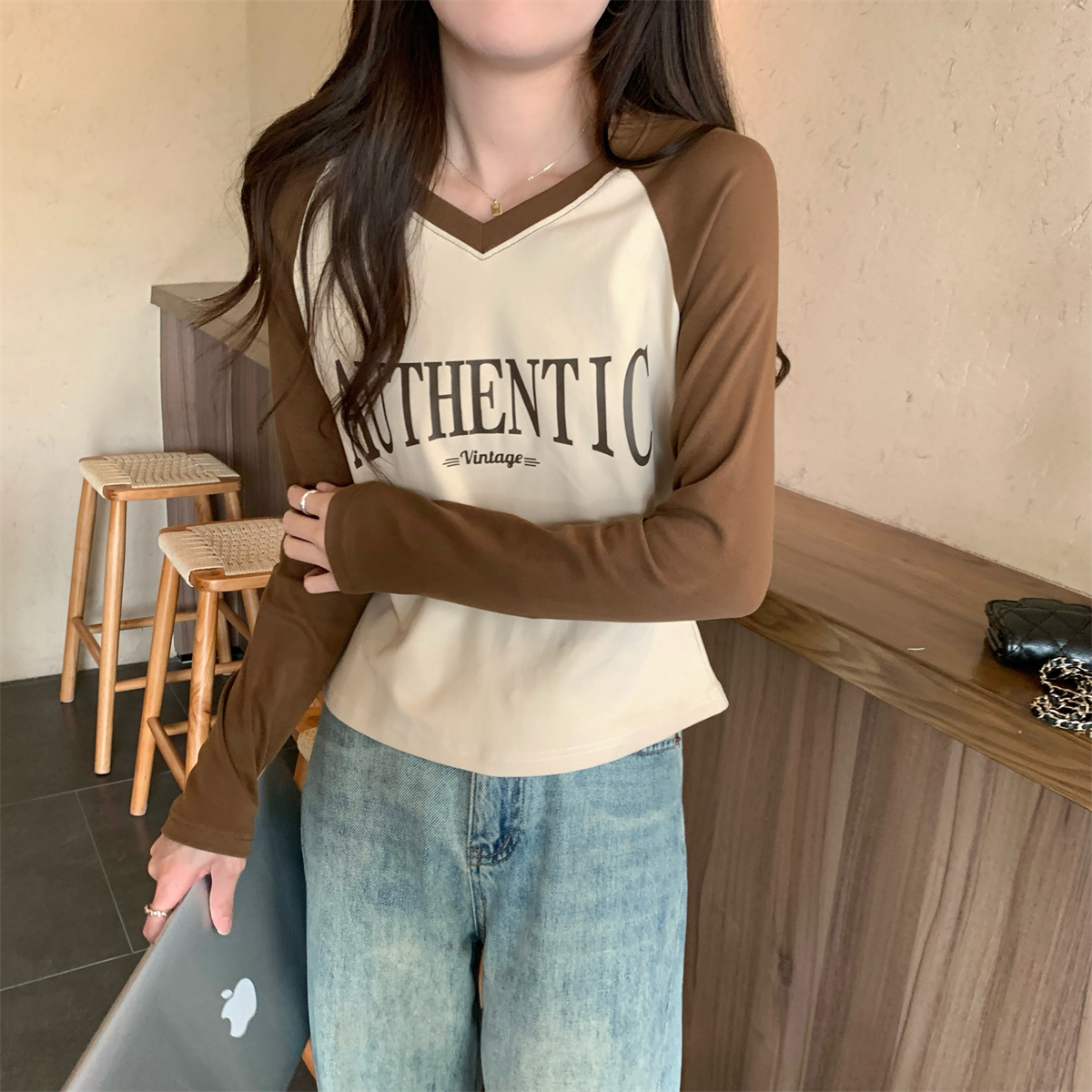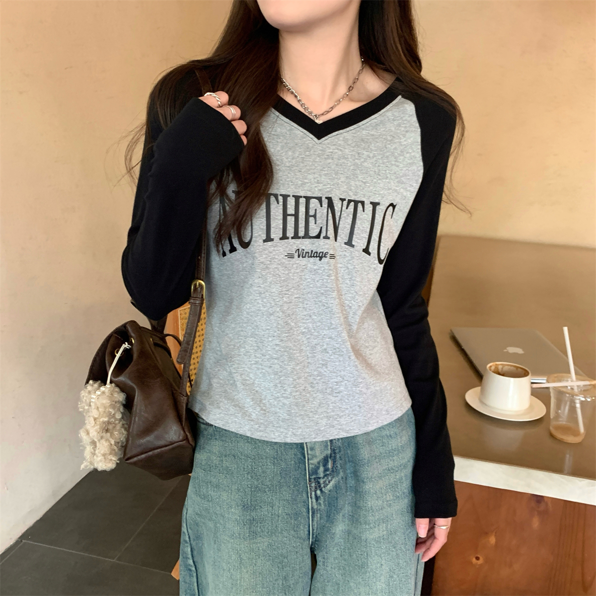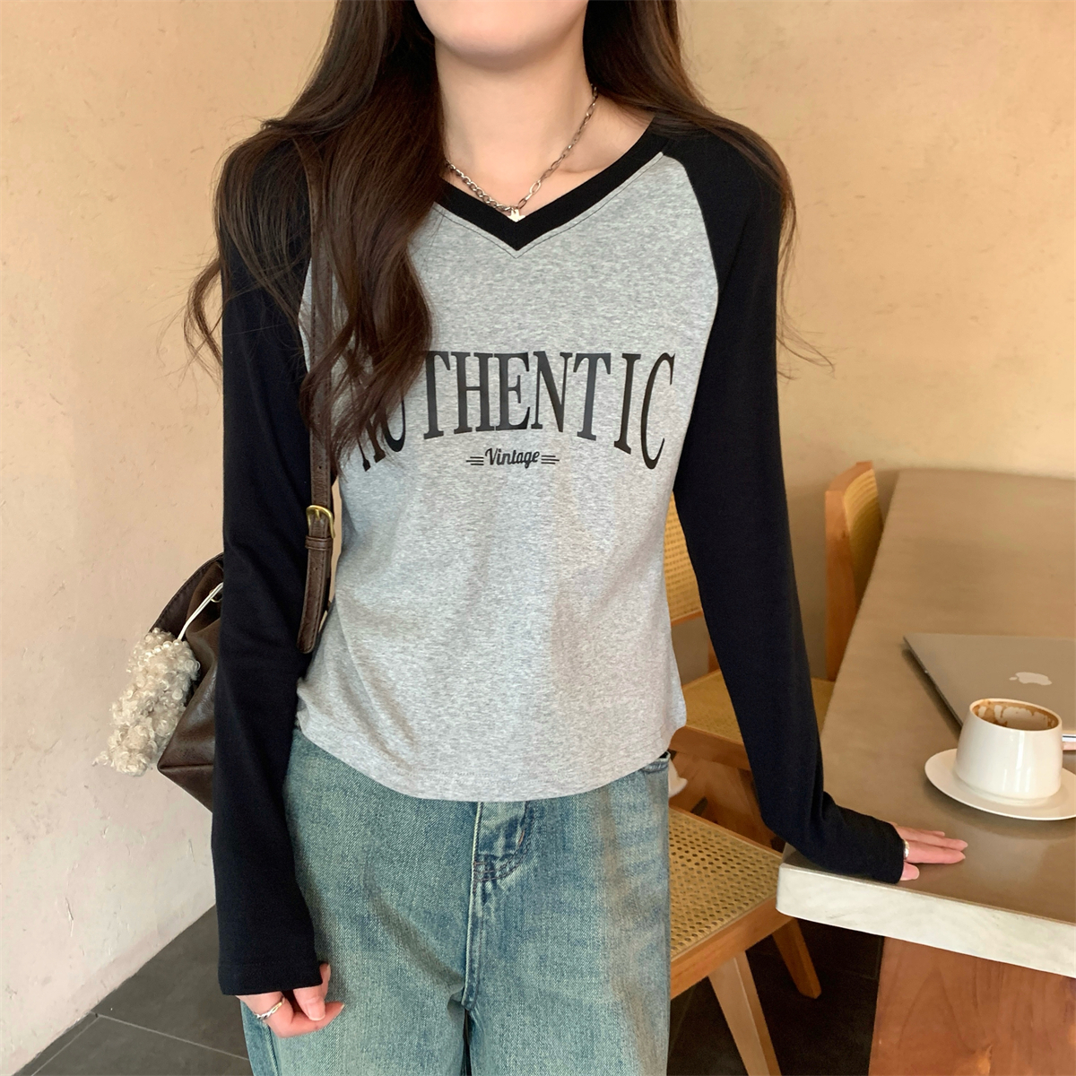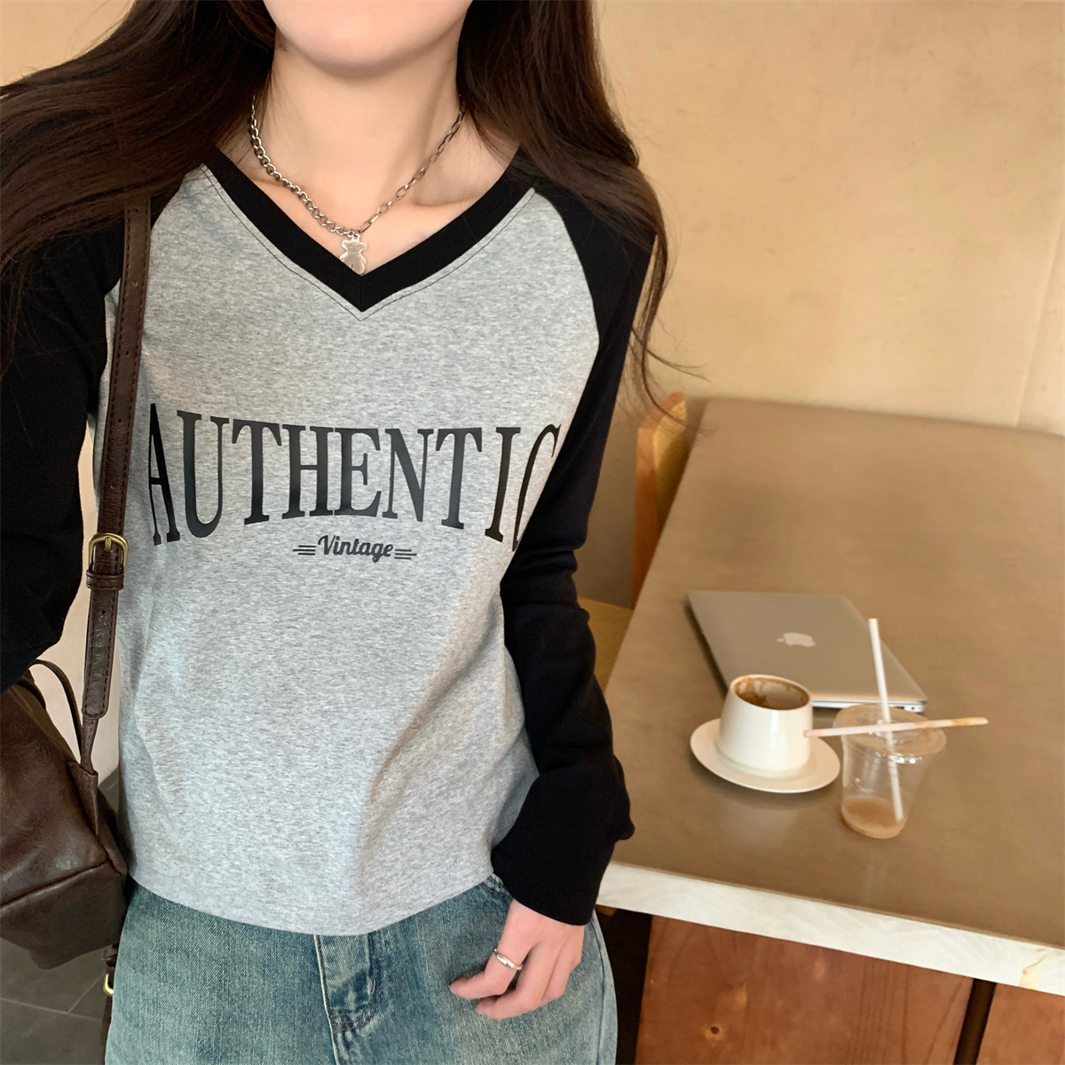 의 스프링 스프링 의 슬림 래그 숄더 대비 아메리칸 편지 인쇄 바 스트립 순수한 면화 긴팔 티셔츠 탑