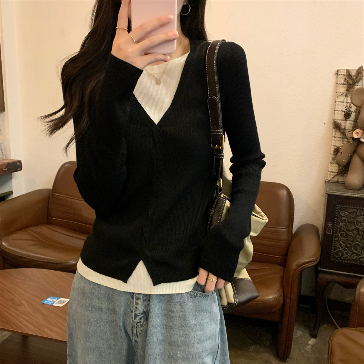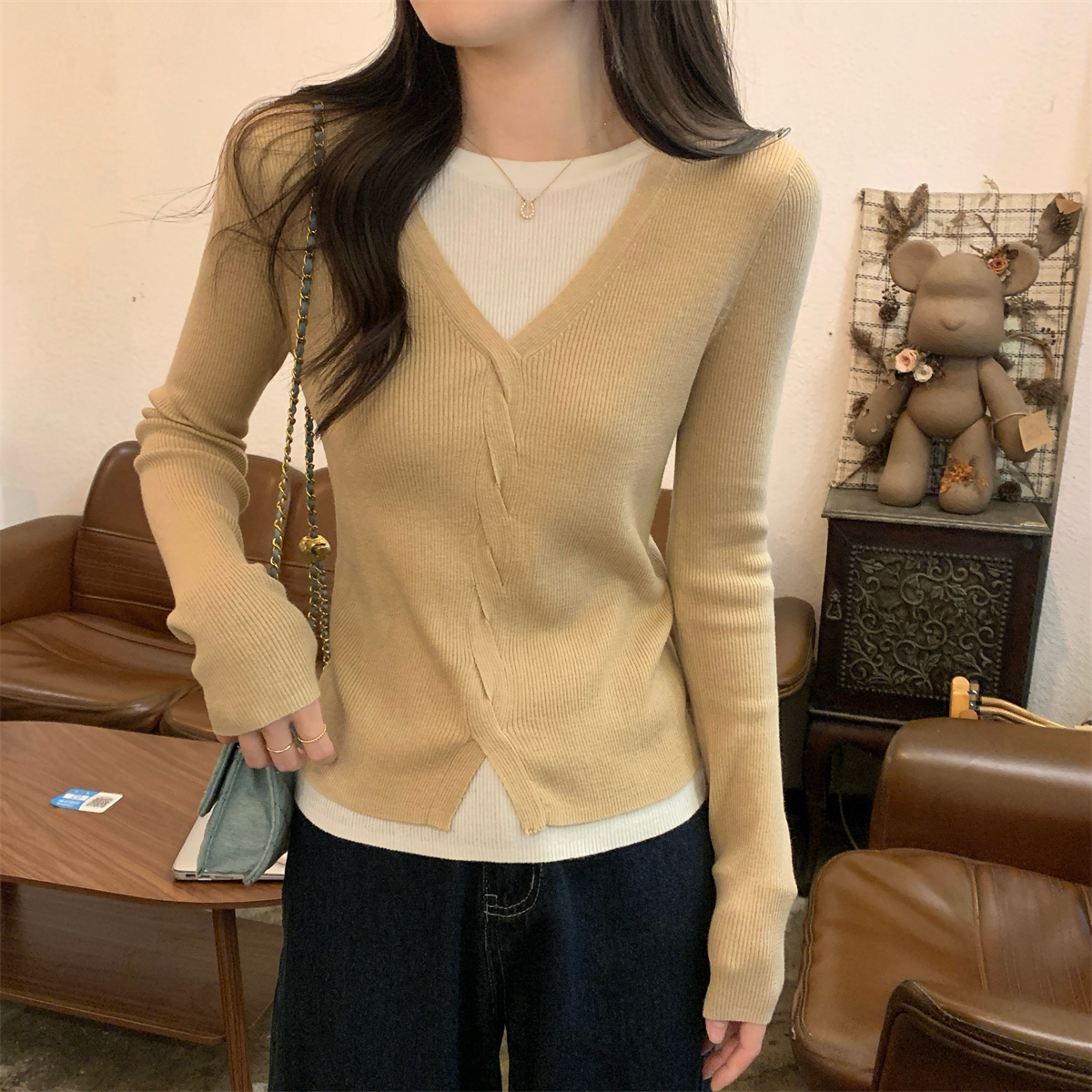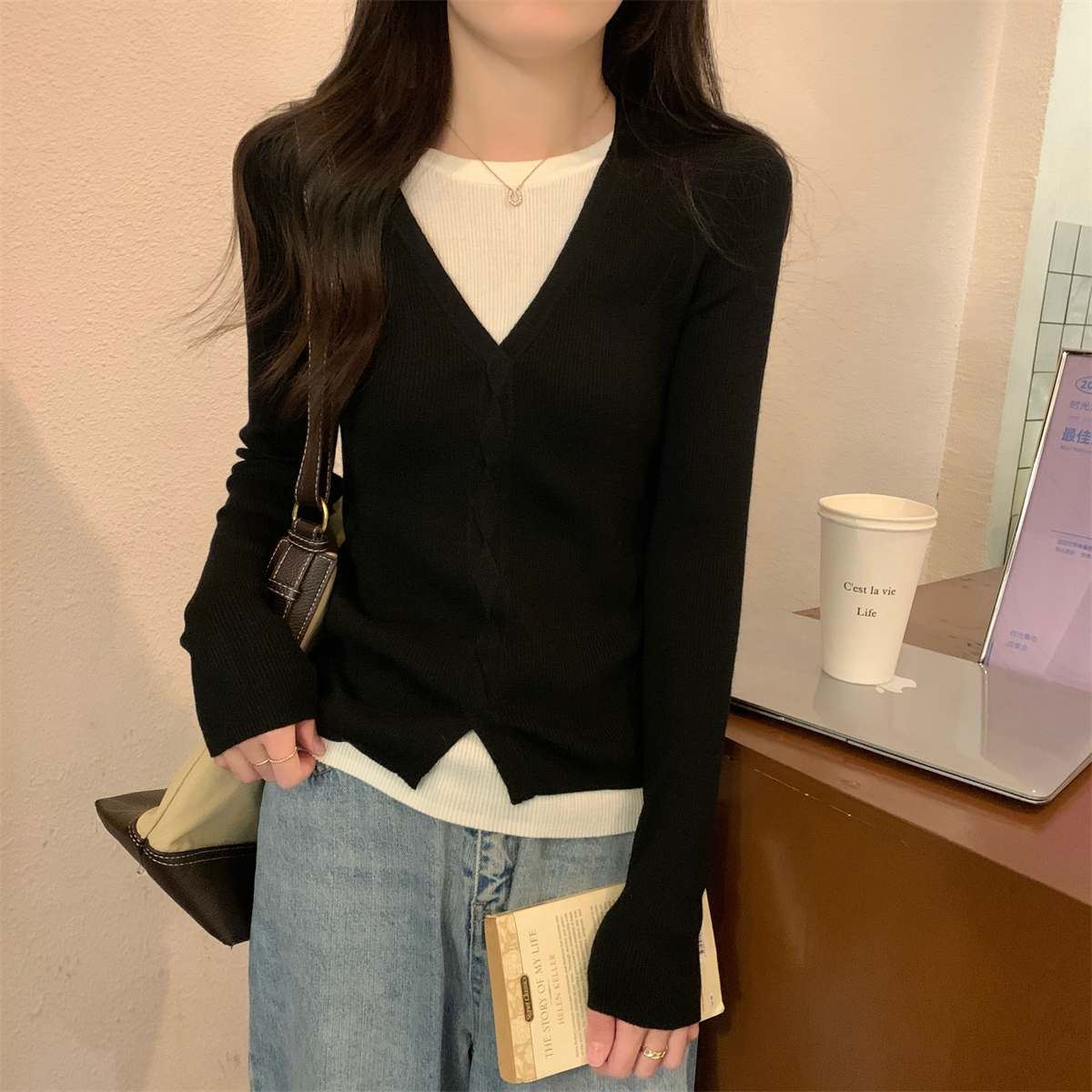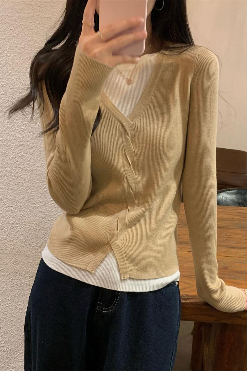 가을 및 겨울 슬림 V- 넥 기질 금속 버클 통합 벨벳 열 내부 니트베이스 스웨터