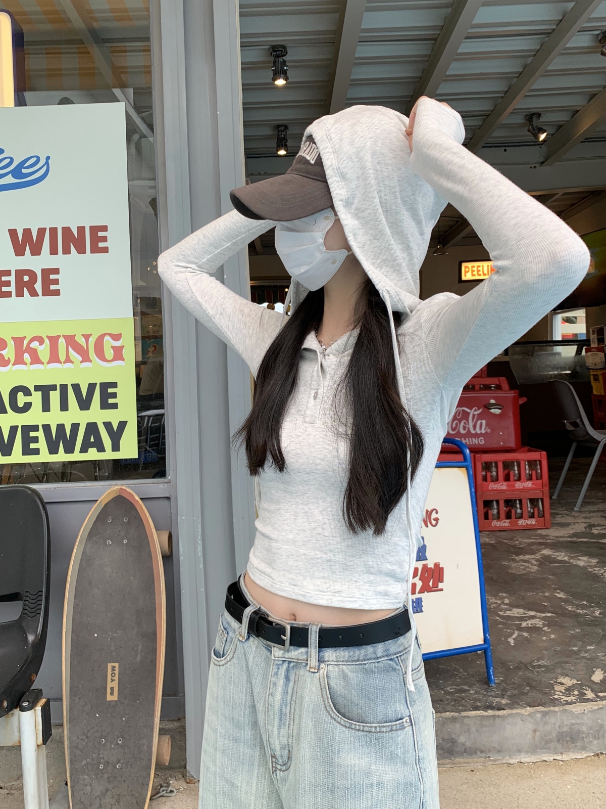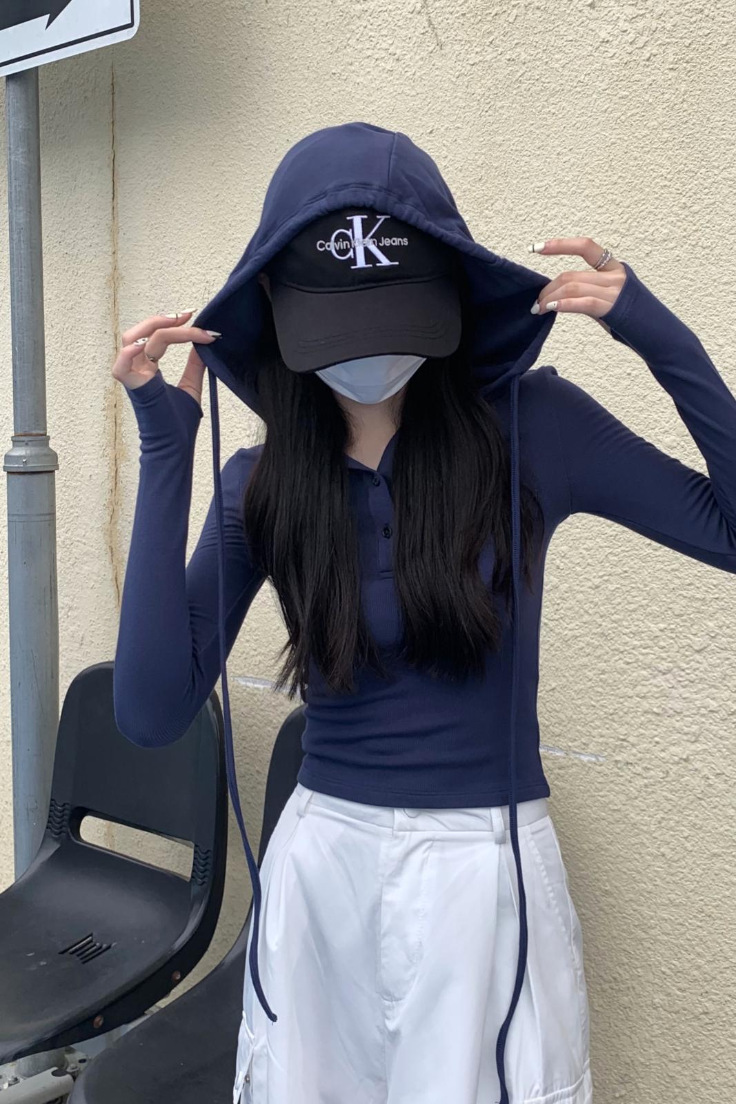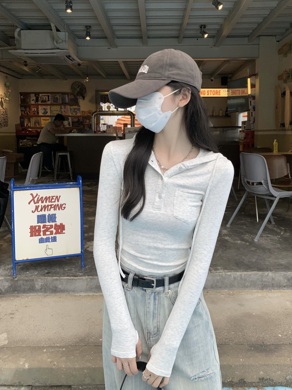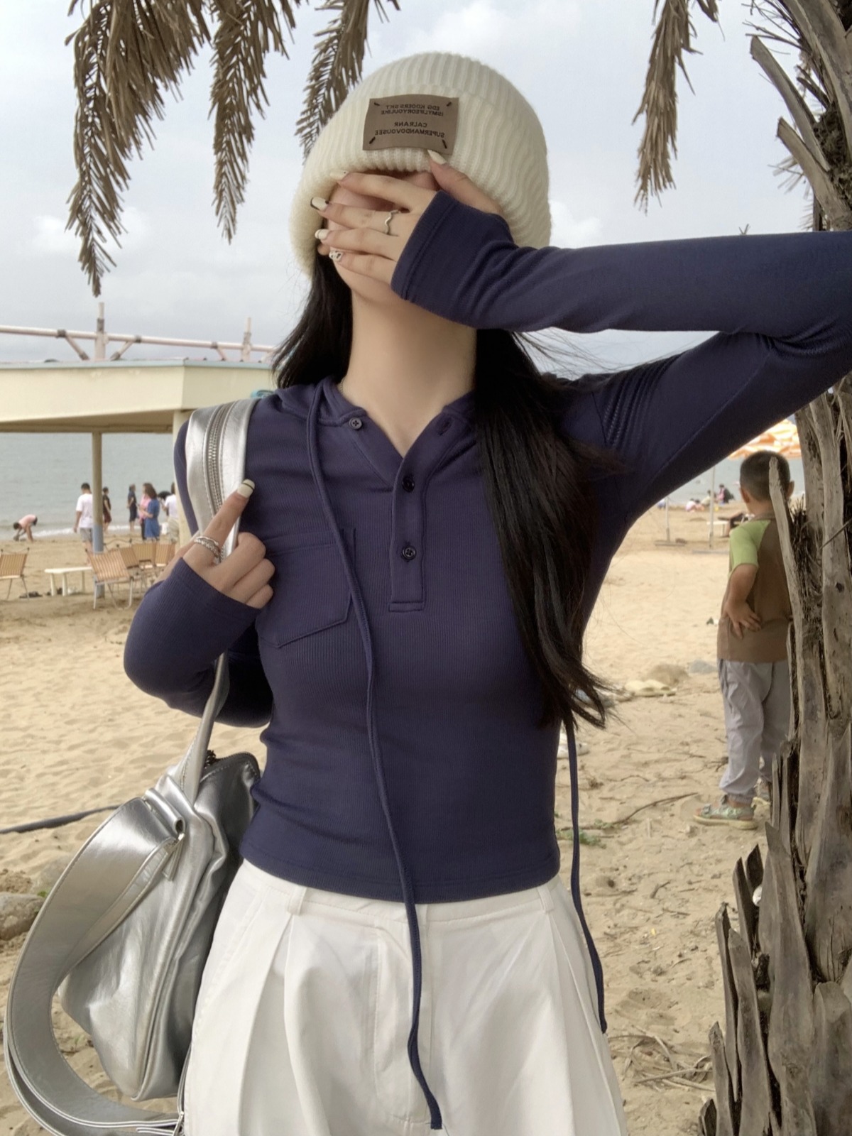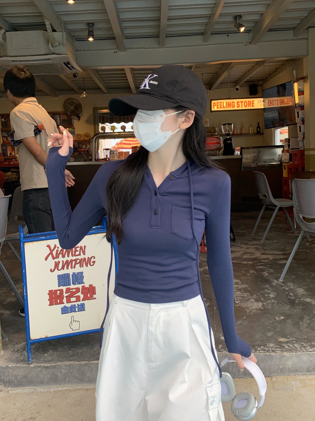 실제 사진 및 이른 봄 한국어 버전의 슬림 대조적 인 컬러 가짜 2 피스 버튼 디자인 순수면 긴팔 티셔츠 탑