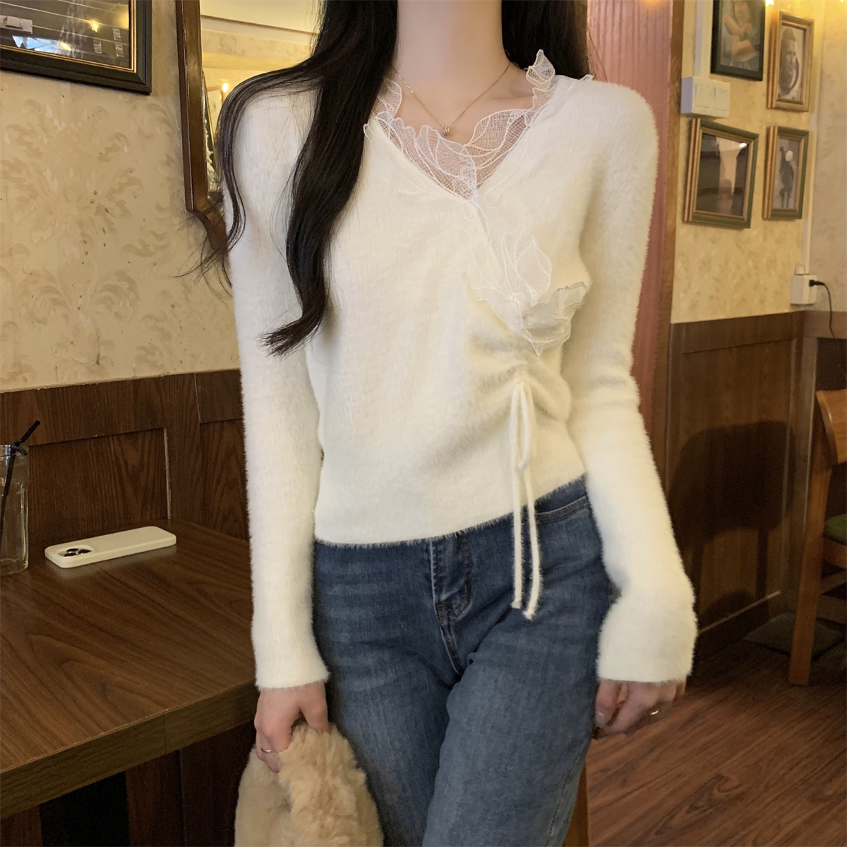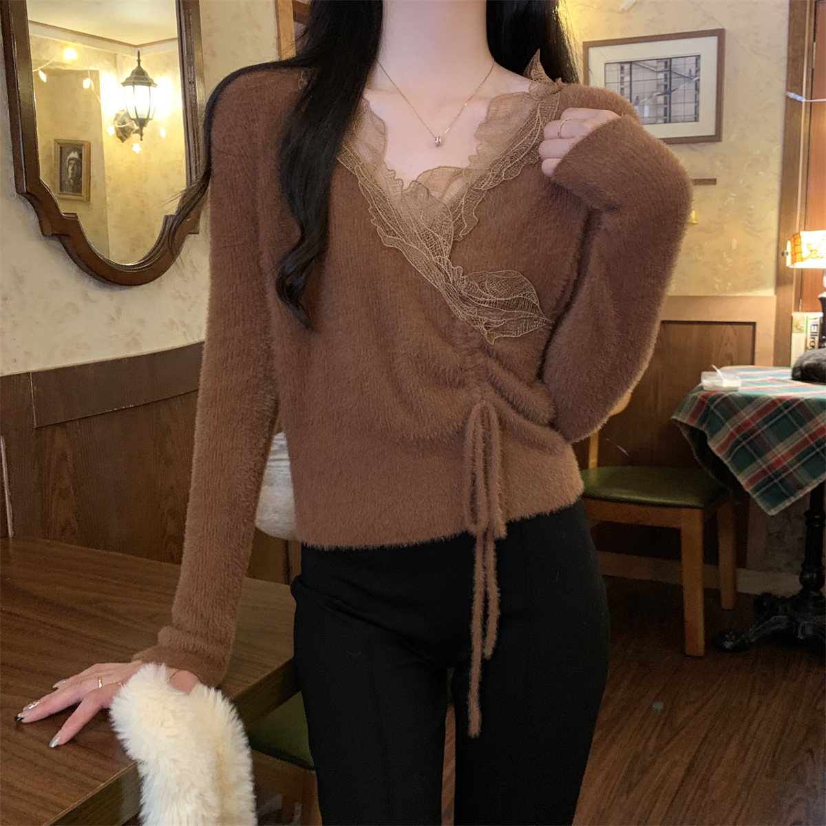 한국 스타일 슬림 정사각형 칼라 버튼 내부 복합 벨벳 따뜻한 티셔츠베이스 셔츠 여성