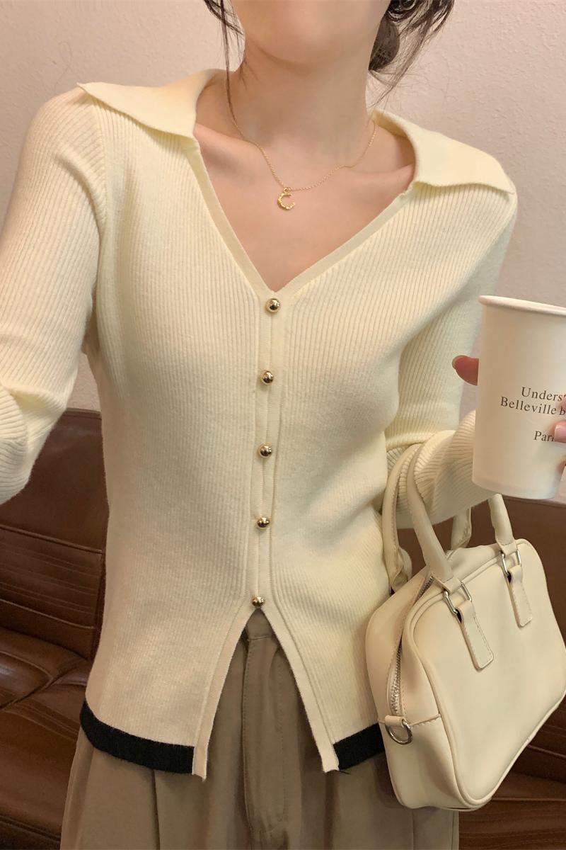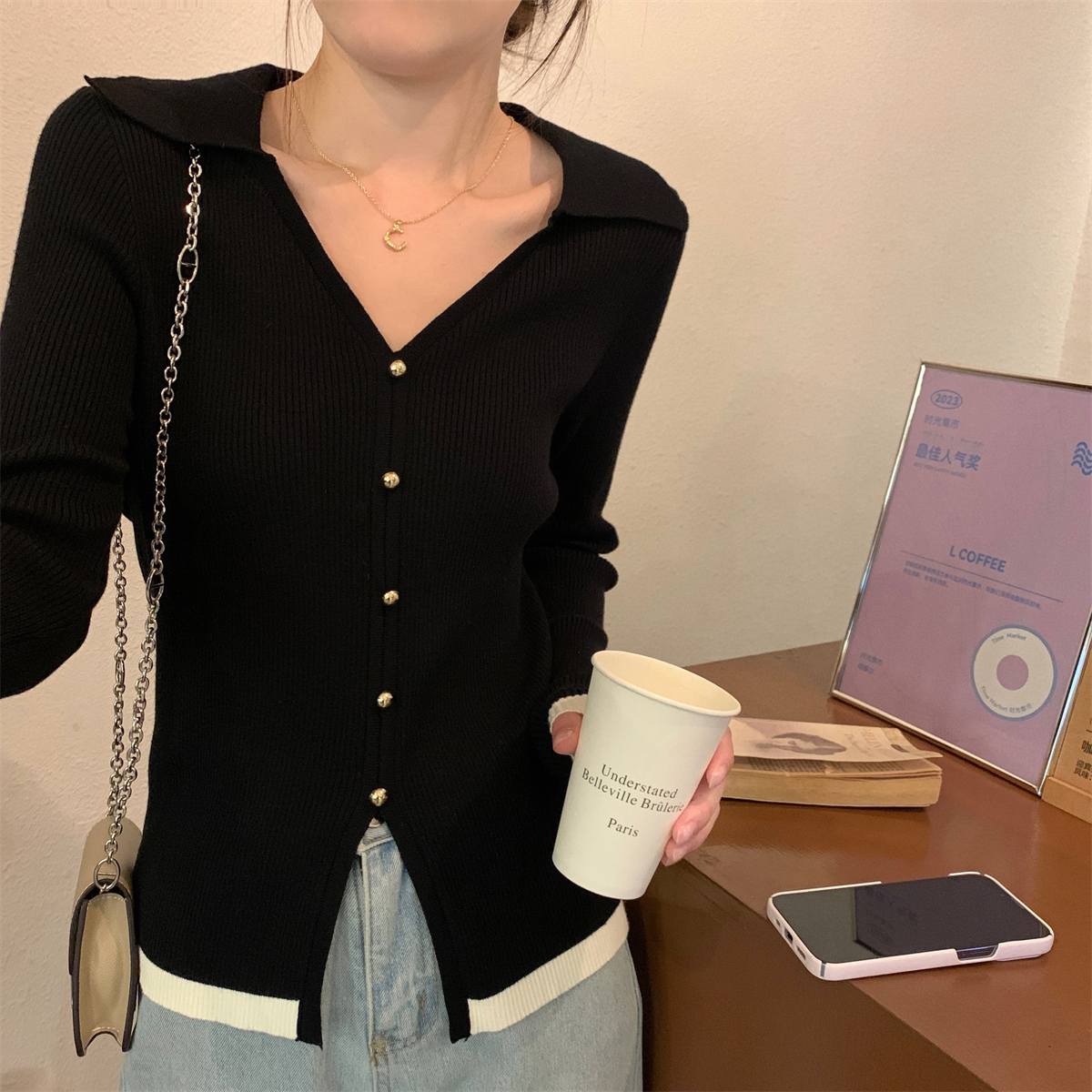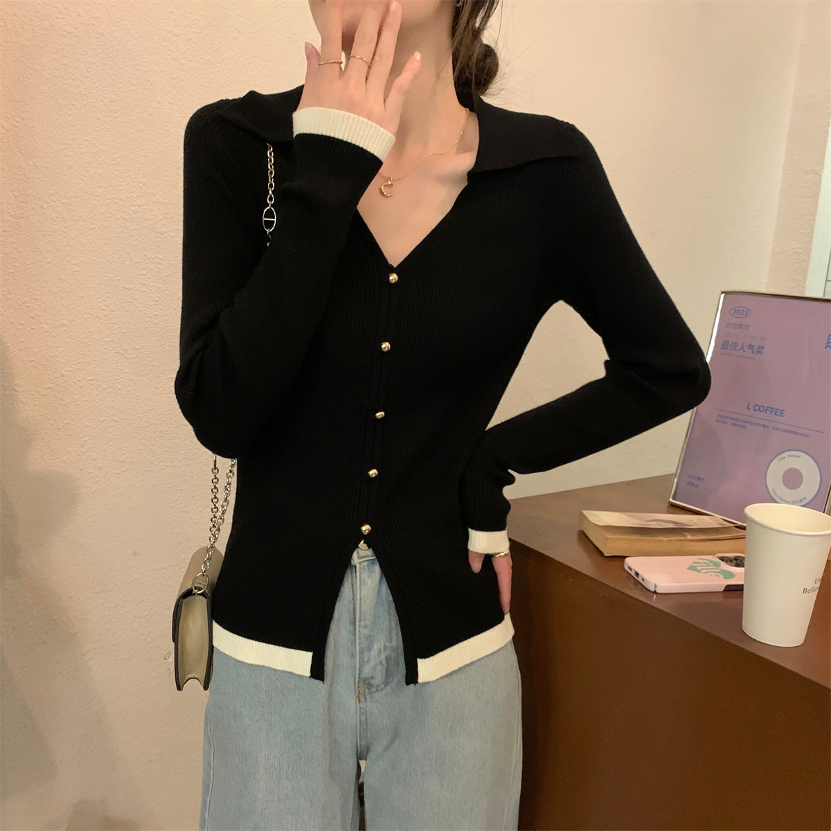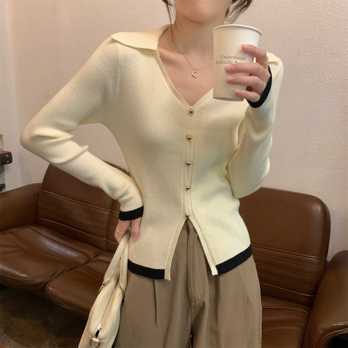 가을 겨울 슬림 컬러 블로킹 및 독특한 폴로 칼라의 실제 의 니트 여성 스웨터와 함께 슬림 한 북극 벨벳 속옷을 보이게합니다.
