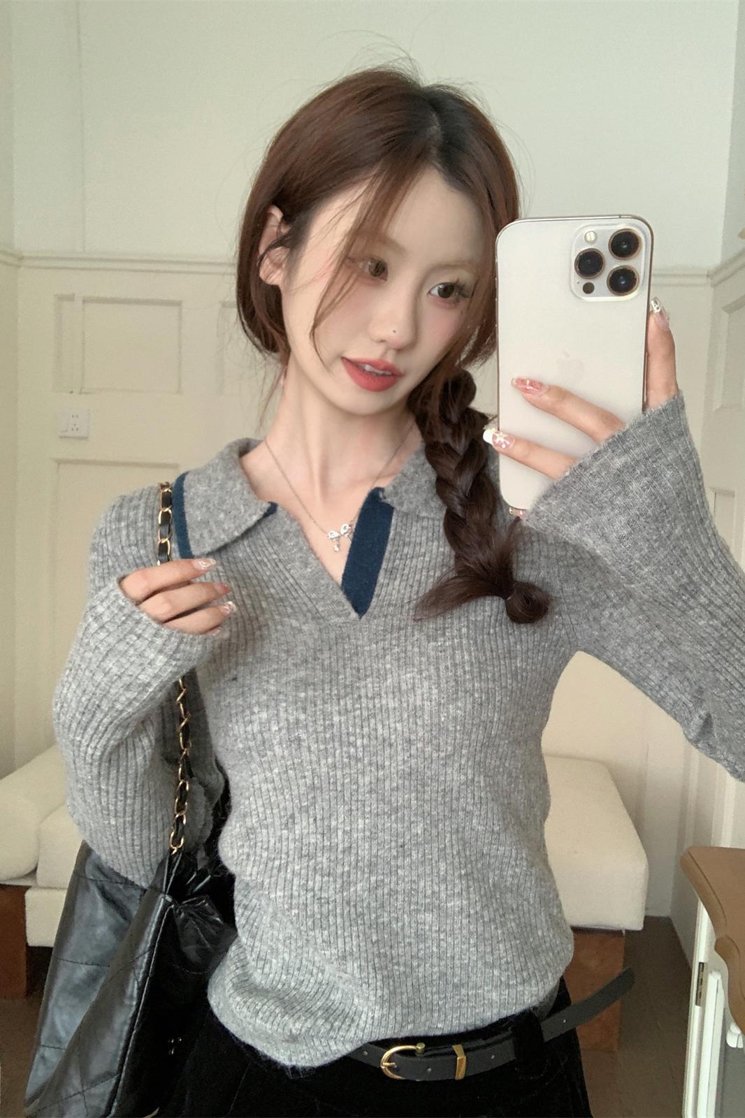 실제 사진 및 가을 및 겨울 한국 스타일 슬림 색상 대비 대비 연령 감소 기질 니트베이스 여성 스웨터