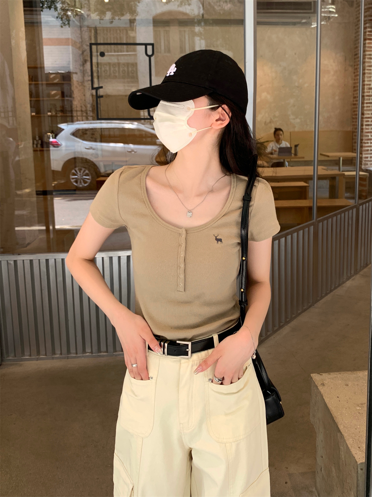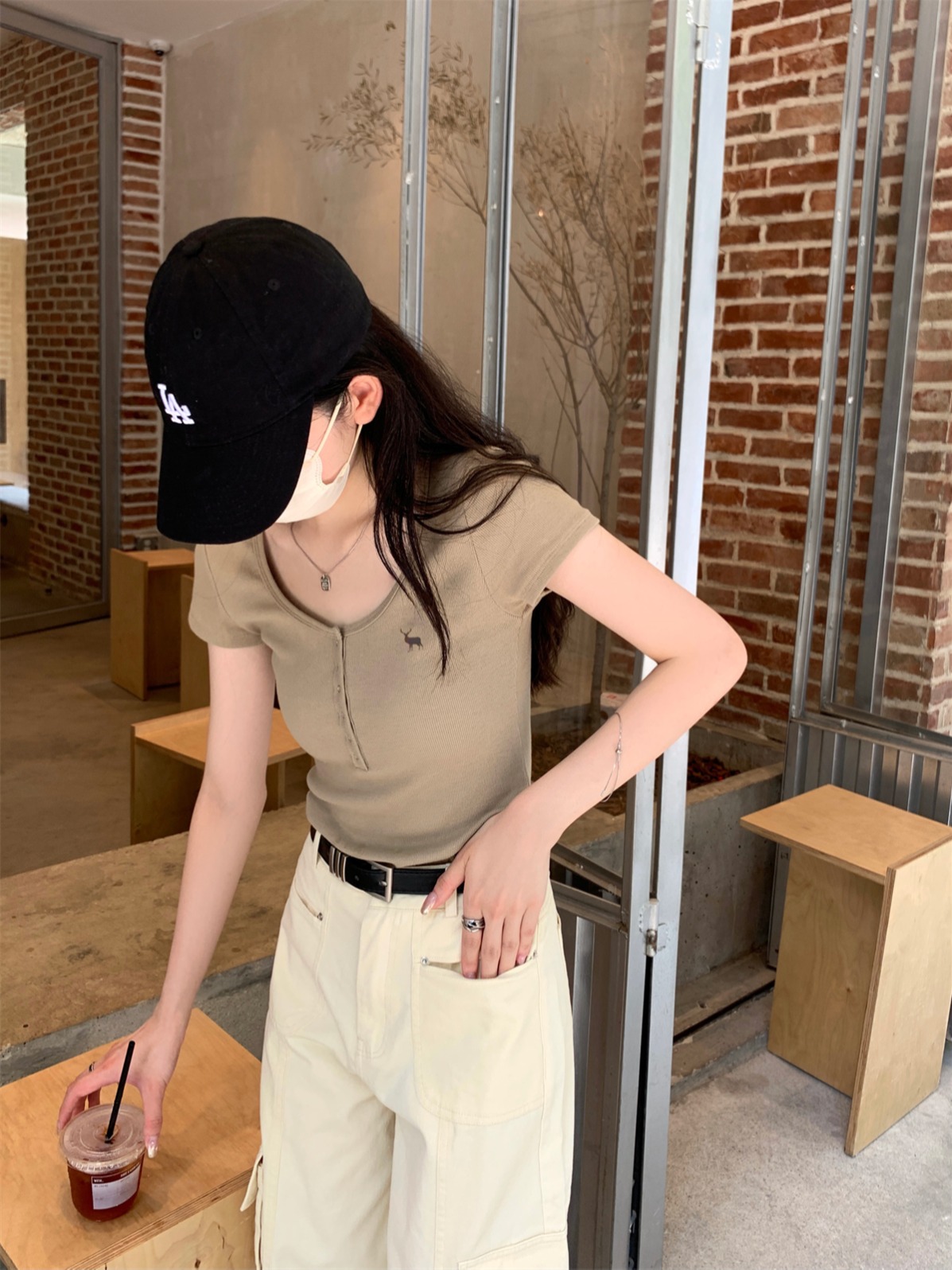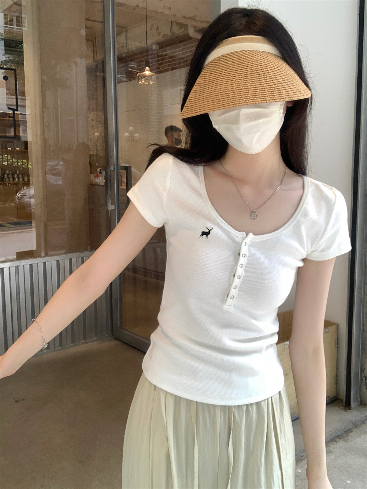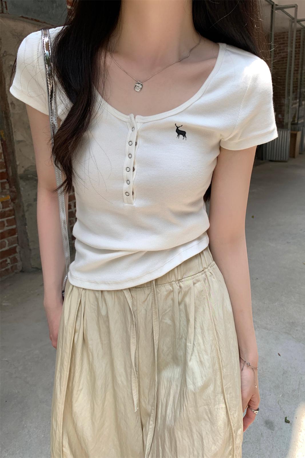 실제 사진 실제 여름 여름 한국어 버전의 슬림 한 라운드 넥 생선 뼈 디자인 다용도 짧은 면화 짧은 슬리브 여성 티셔츠 탑