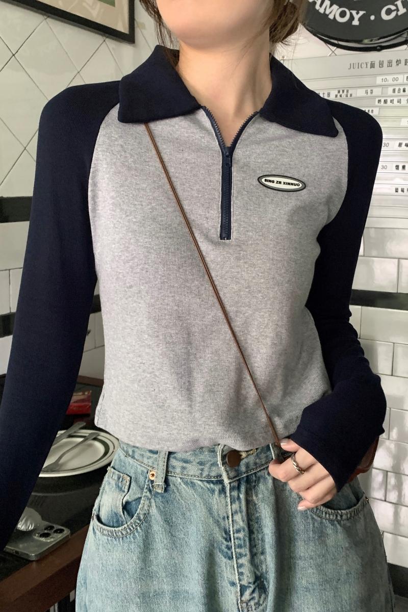 여름 한국 스타일 슬림 기질 폴로 칼라 뼈 디자인 다목적 순수면 단락 티셔츠 탑
