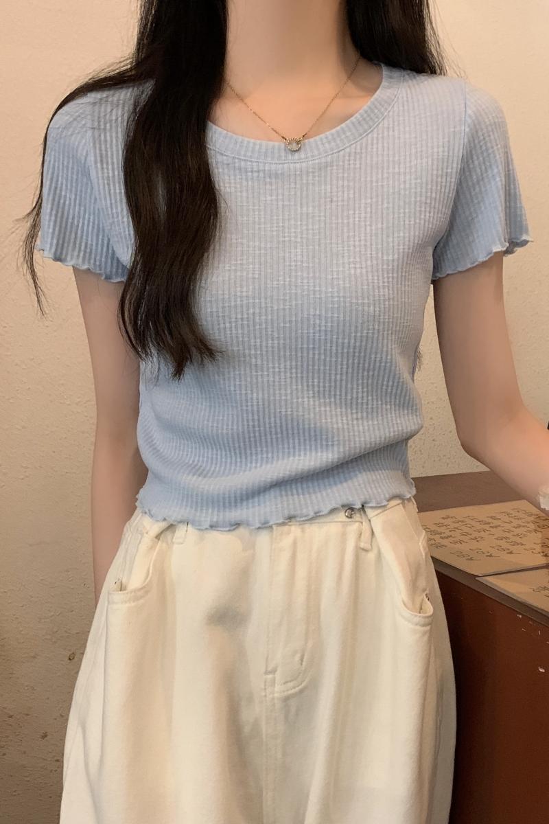 스프링 스프링 한국어 버전 순수 슬림 슬릿 달콤한 디자인 긴팔 티셔츠 여자 탑