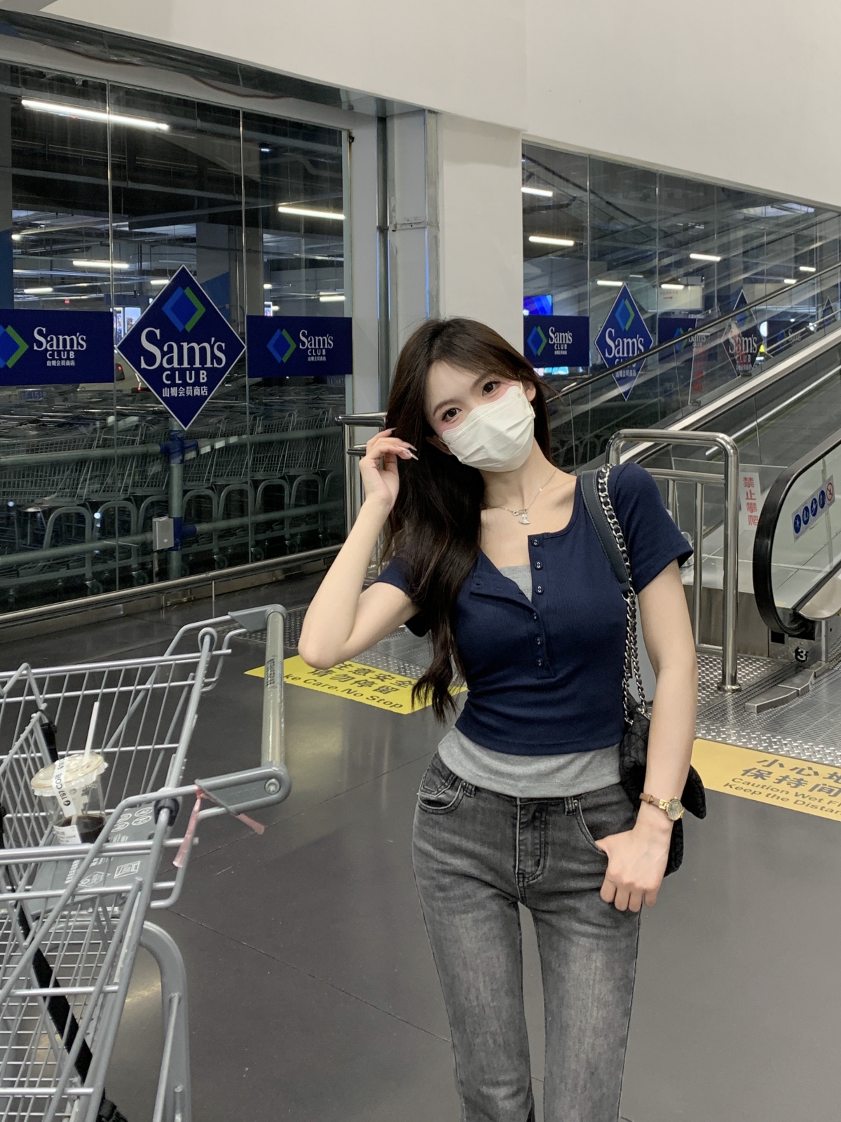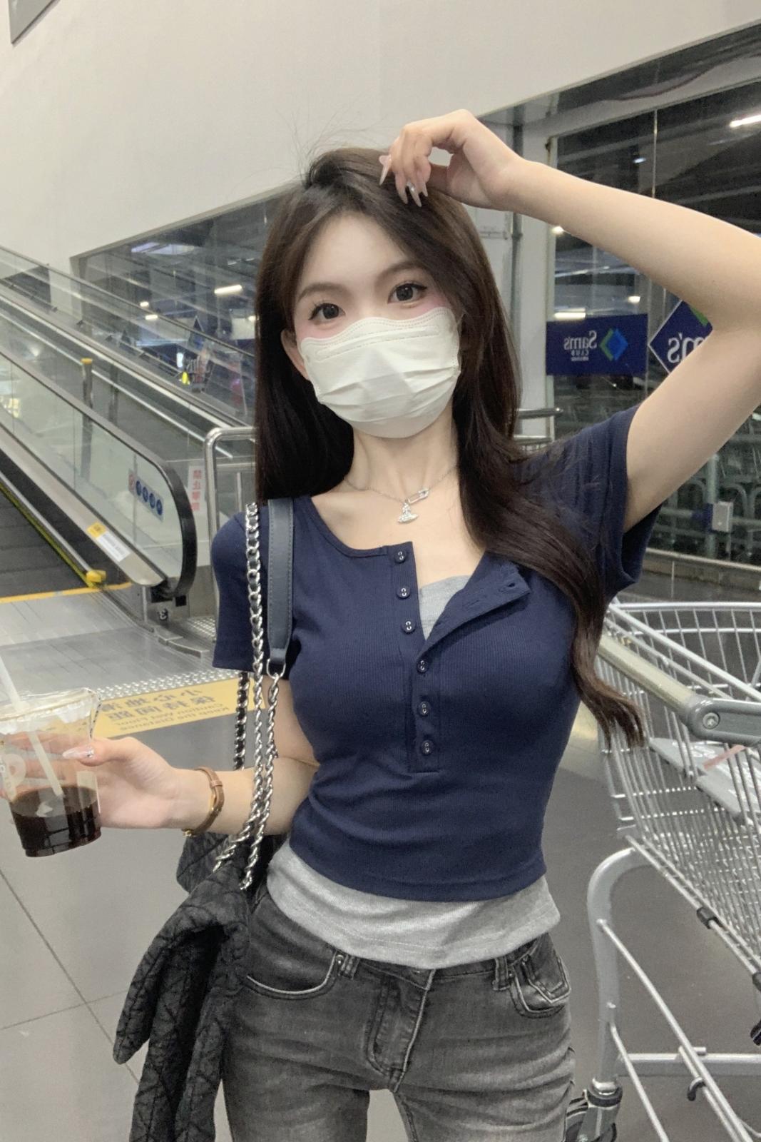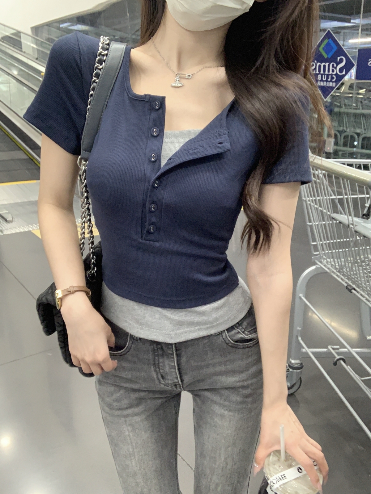 봄 여름 한국 스타일 슬림 정사각형 칼라 주름 디자인 다목적 니트 짧은 슬리브 여성 탑