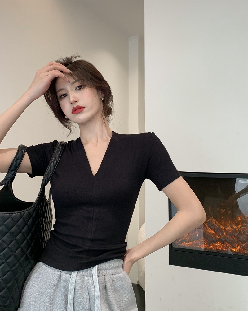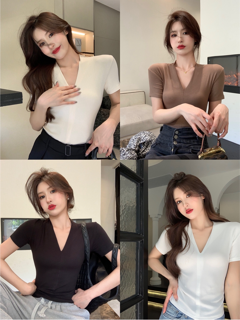 새로운 여름 홍콩 스타일 레트로 세련된 V-Neck 짧은 슬림 한 슬림하고 세련된 내부 탑을 가진 여성을위한 진짜 샷