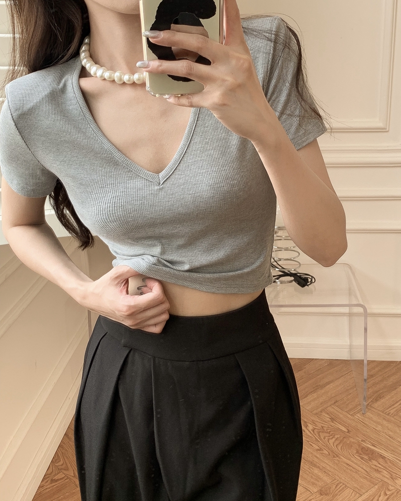 여름 홍콩 스타일의 사진 소형 섹시 v- 넥 탄성 슬림 한 짧은 어깨 패드 짧은 슬리브 티셔츠 여자 스키딩 거북이 탑