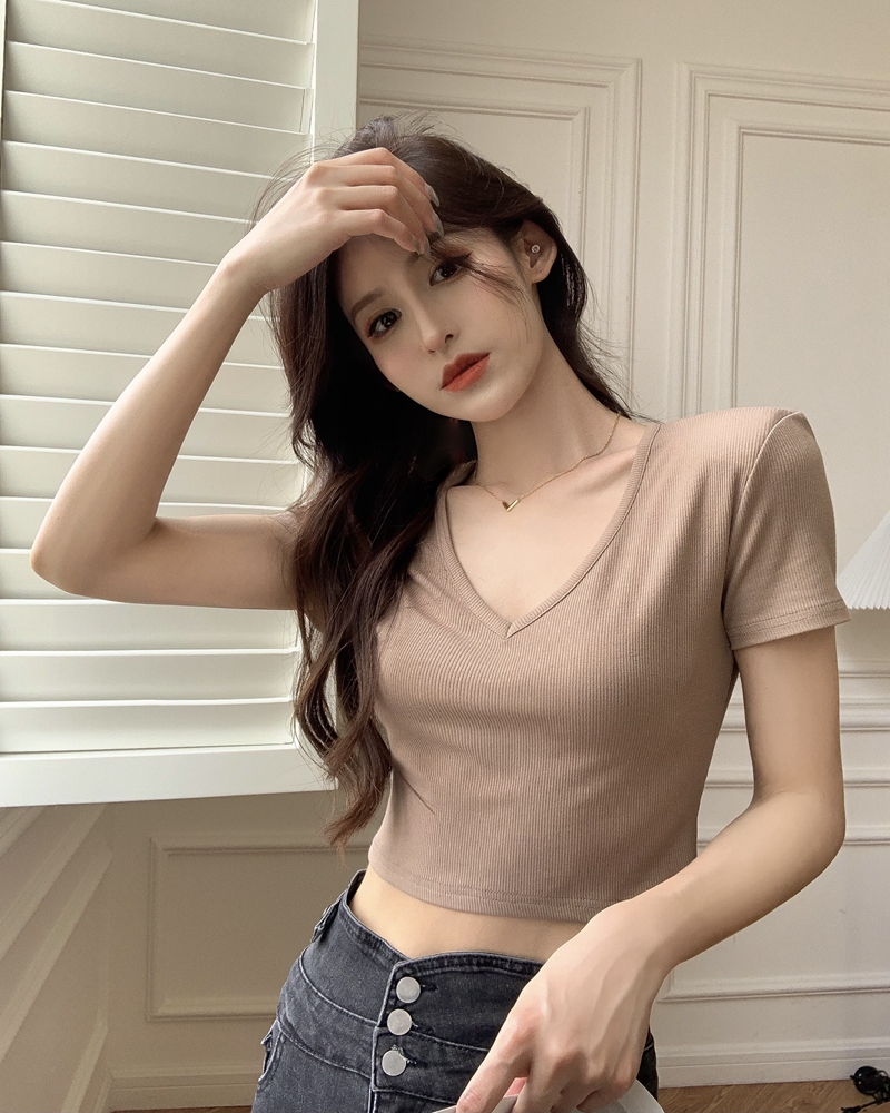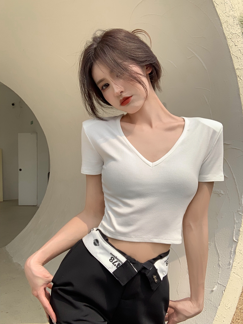여름 홍콩 스타일의 사진 소형 섹시 v- 넥 탄성 슬림 한 짧은 어깨 패드 짧은 슬리브 티셔츠 여자 스키딩 거북이 탑