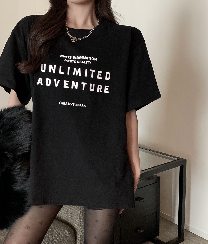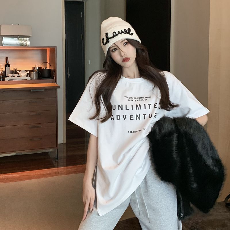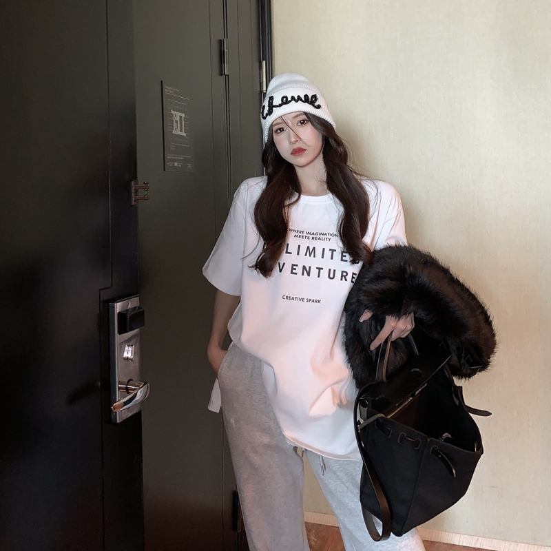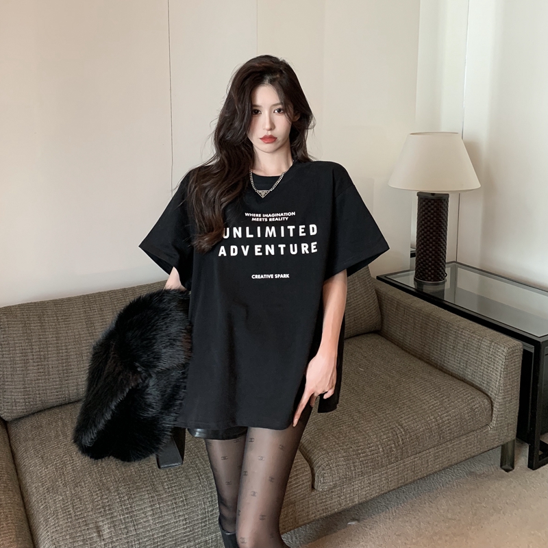 가을과 겨울 홍콩 스타일의 사진 촬영 편지 인쇄 두꺼운 짠 짠 짜기 면적 중간 길이 반팔베이스 티셔츠 탑