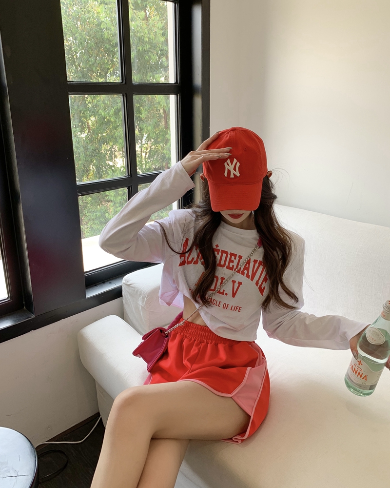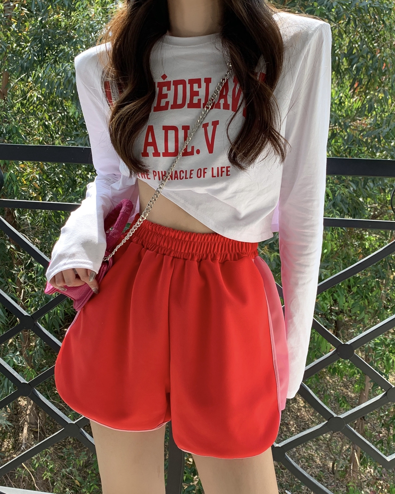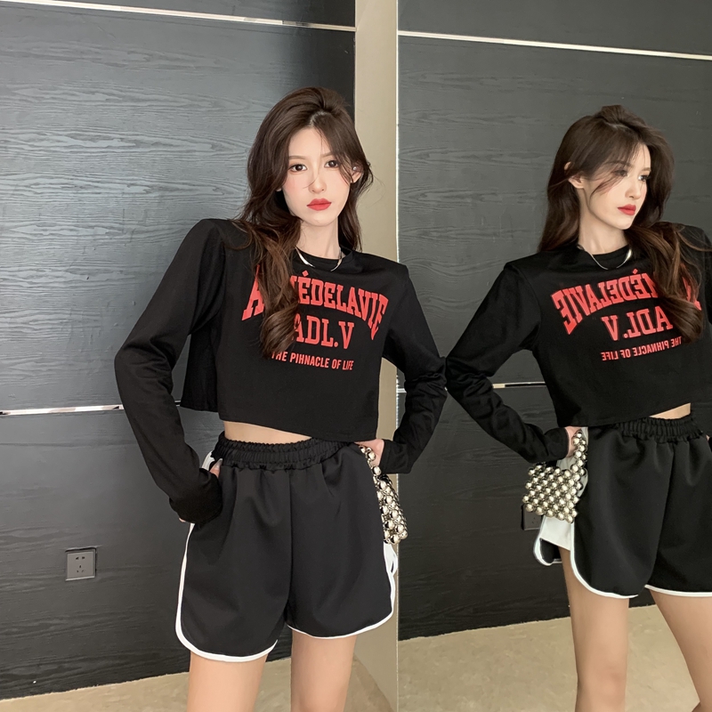 봄과 여름 새로운 스타일 홍콩 스타일 세련된 편지 짧은 긴팔 어깨 패드 티셔츠 + 하이 웨이스트 느슨한 넓은 버전 반바지 슈트