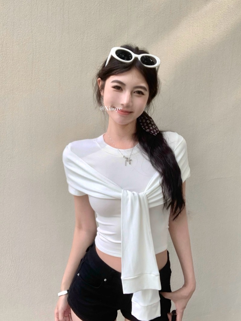 실제 가격 여름 핫 소녀 스타일 숄 가짜 2 피스 라운드 목선 직선 어깨 어깨 짧은 슬리트 티셔츠 여자 디자인 스트랩 탑