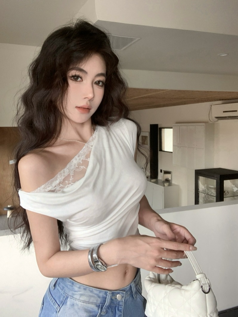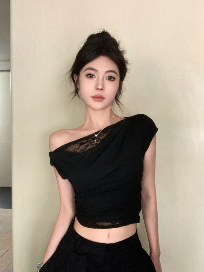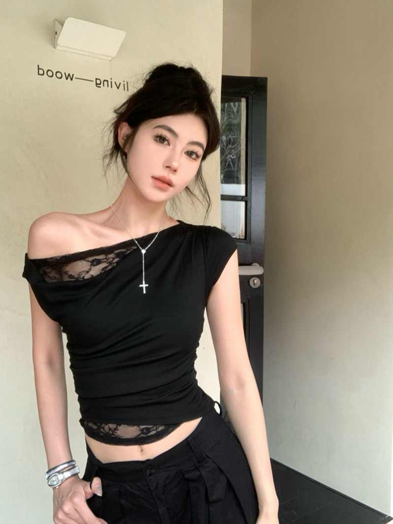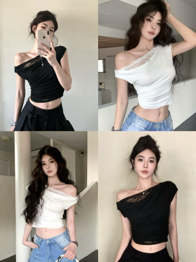 실제 1 개의 숄더 스 플라이 싱 칼라 탑 라이트와 순수한 레이스 오프 숄더 불규칙한 응축 단석 티셔츠