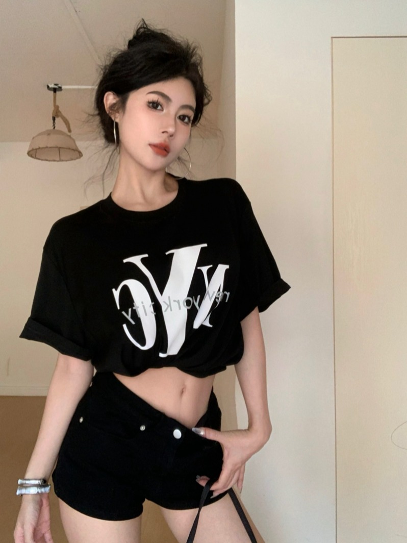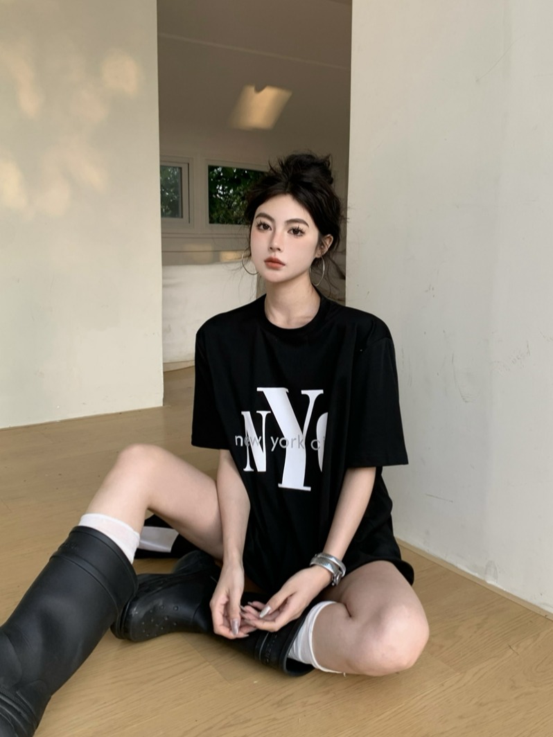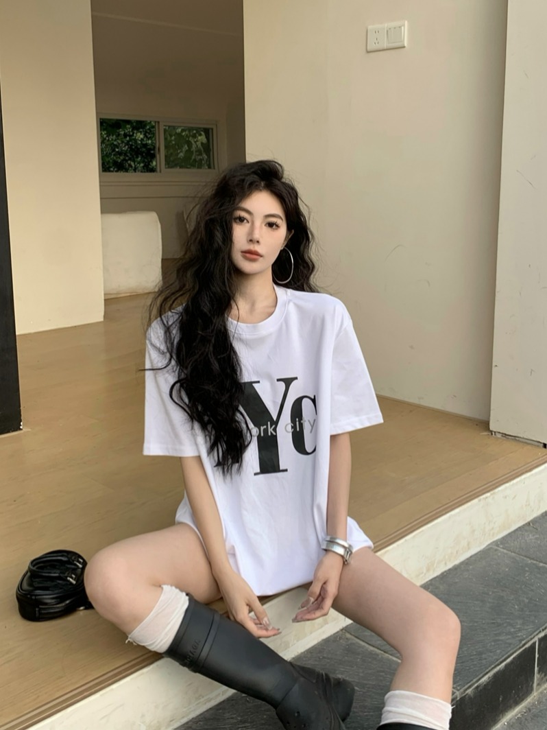 실제 가격 여름 새로운 핫 걸 스타일 편지 인쇄 느슨한 넓은 버전 중간 길이의 짧은 소매 티셔츠 세련된 탑