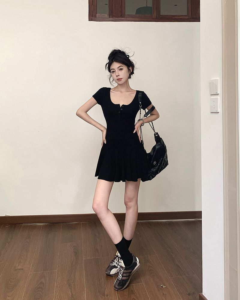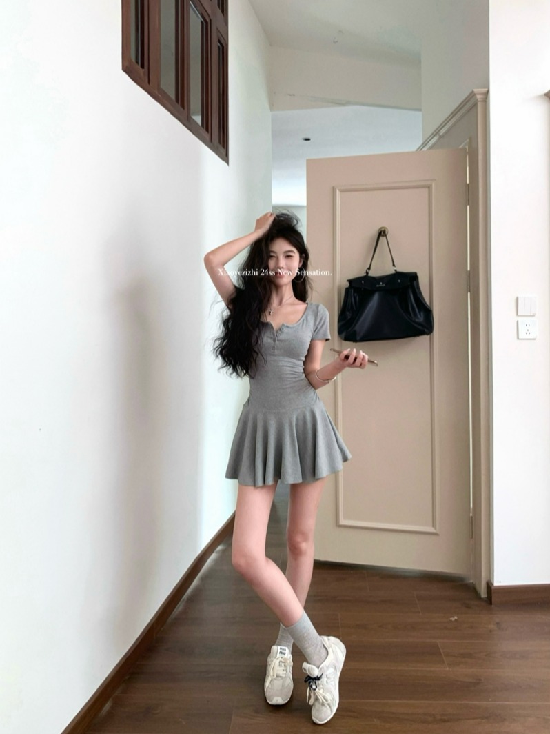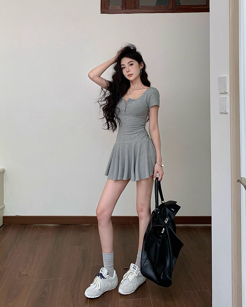 진짜 가격 여름 순수 욕망 대학 스타일 U-Collar Waist 주름 치마 짧은 슬리브 드레스 하이 허리 반바지 정장