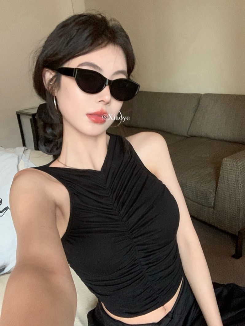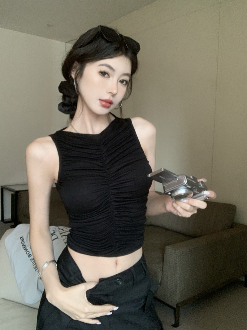 실제 가격 여름 핫 걸 스타일 디자인 슬림 하이 탄성 슬림 한 얼음 실크 조끼 여성 짧은 소음기 상단