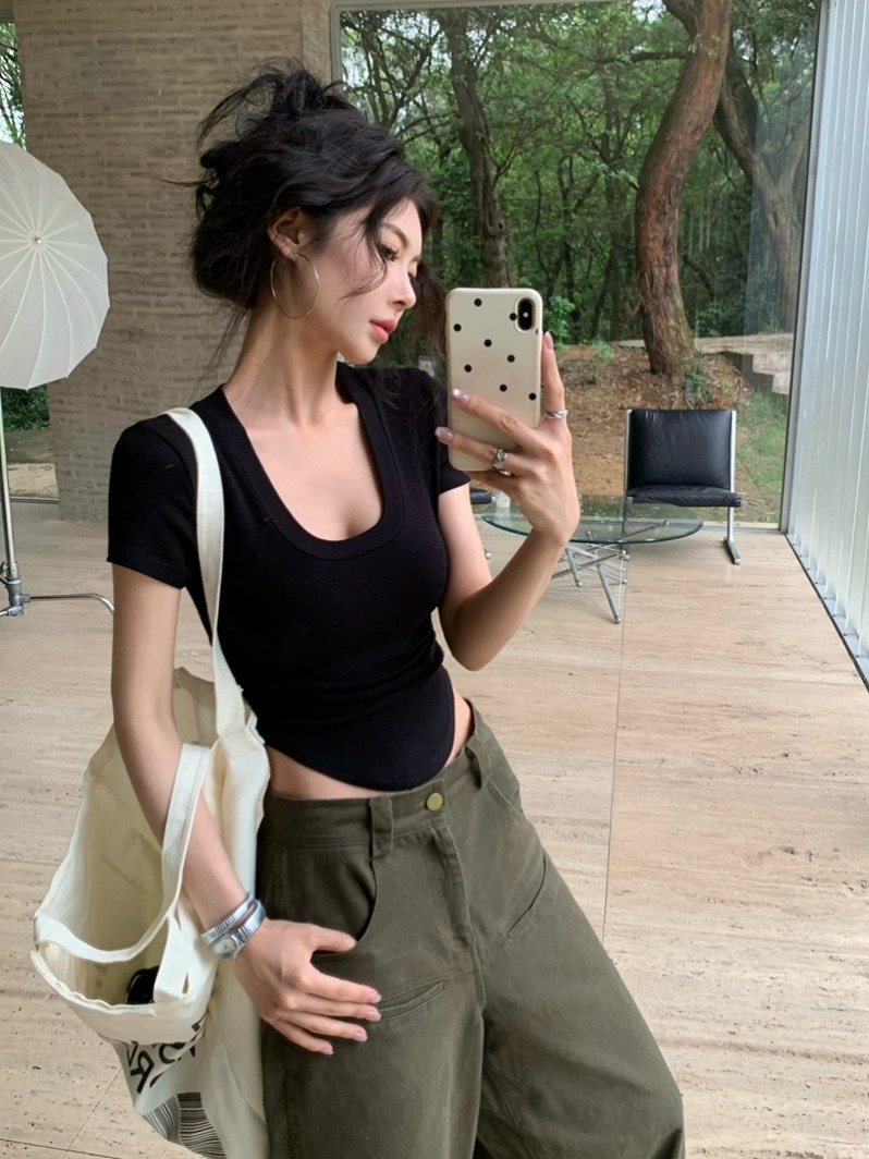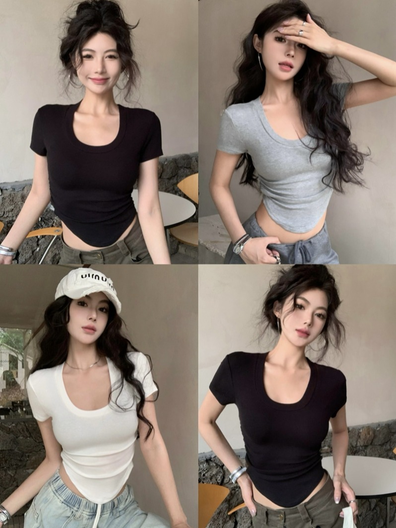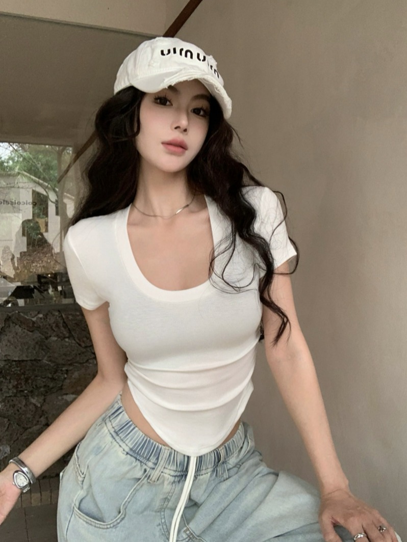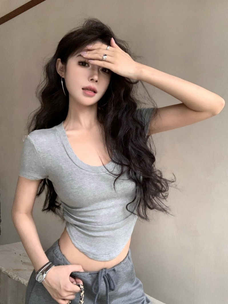 실제 가격 여름 순수한 핫 걸 스타일 슬림하고 슬림 U-넥 짧은 슬림 티셔츠 주름 하이 웨이스트 쇼트 탑