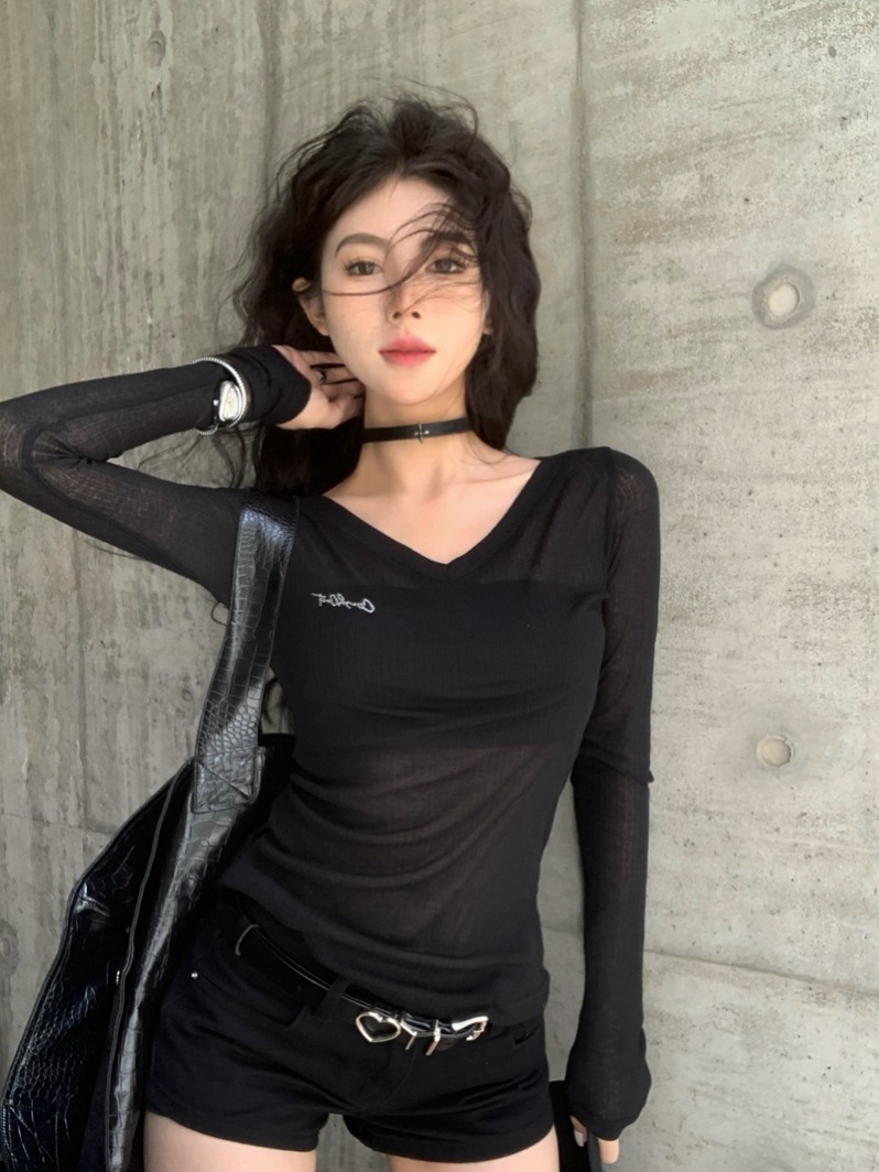 실제 가격 여름 핫 걸 스타일 v- 넥 슬림 핏 및 슬림 문자 핫 다이아몬드 얇은 긴팔 선 스크린 티셔츠 관점 상단