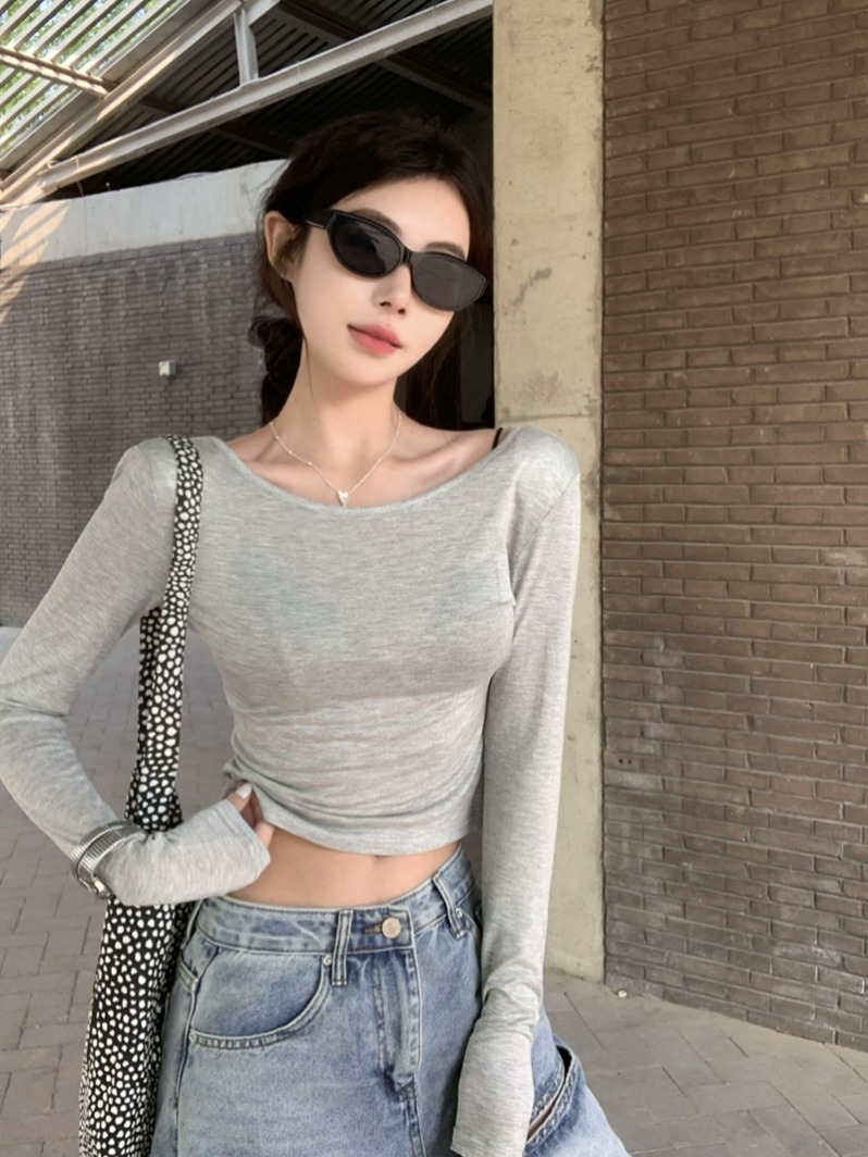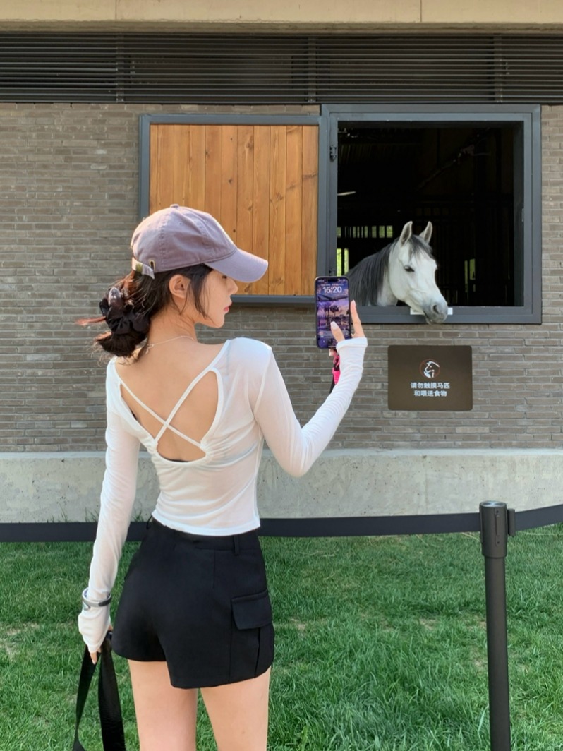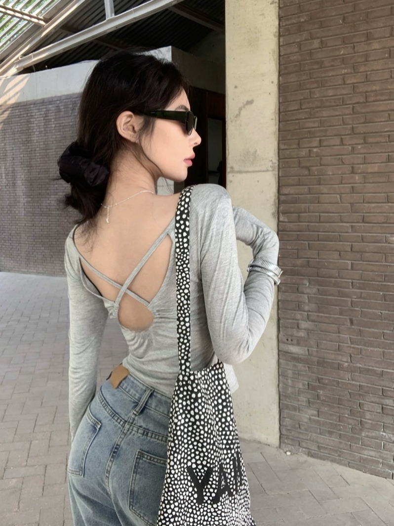 진짜 가격 여름 핫 걸 스타일 크로스 중공 등이없는 어깨 패드 긴 소매 티셔츠 여성용 얇은 테니스 선 보호 탑