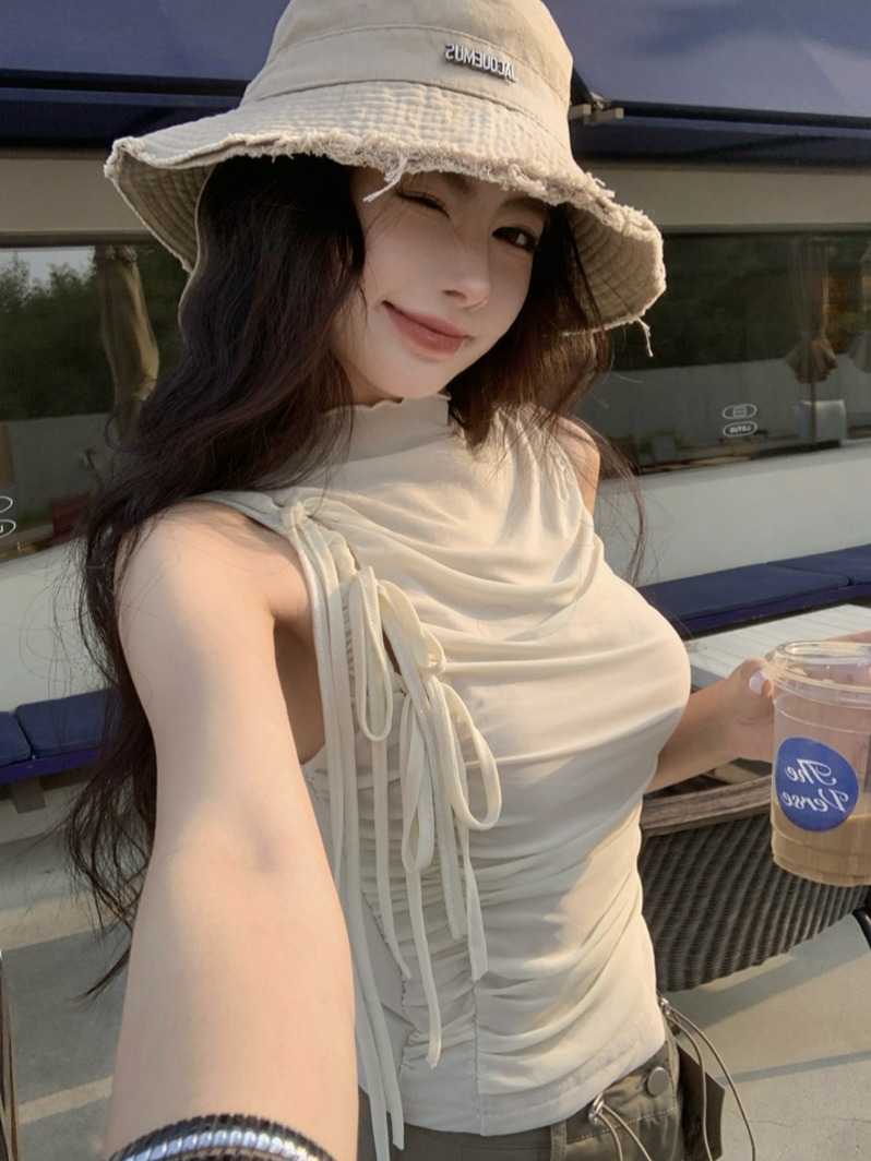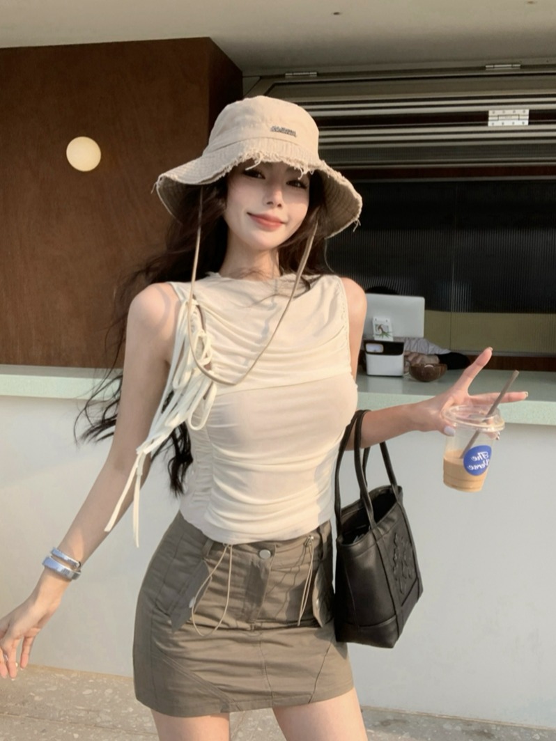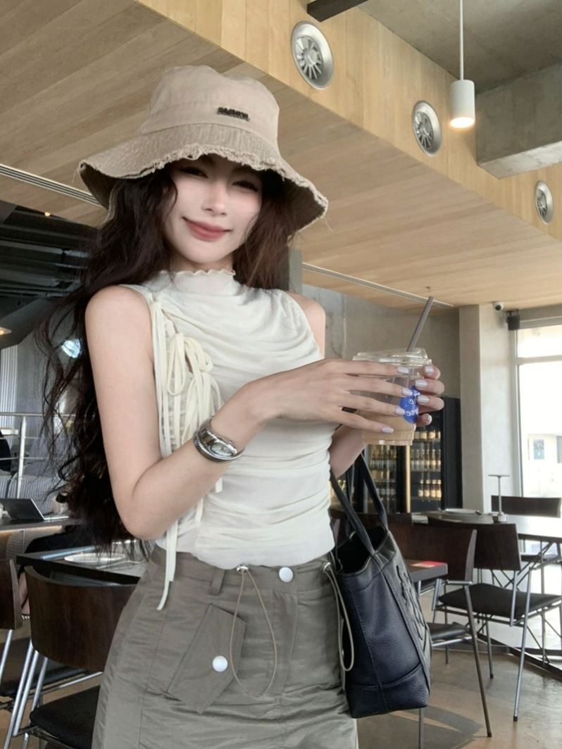 실제 여름 디자인 메쉬 스트랩 탄성 허리 주름 조끼 여성 Cool Sleeveless Rolled Top