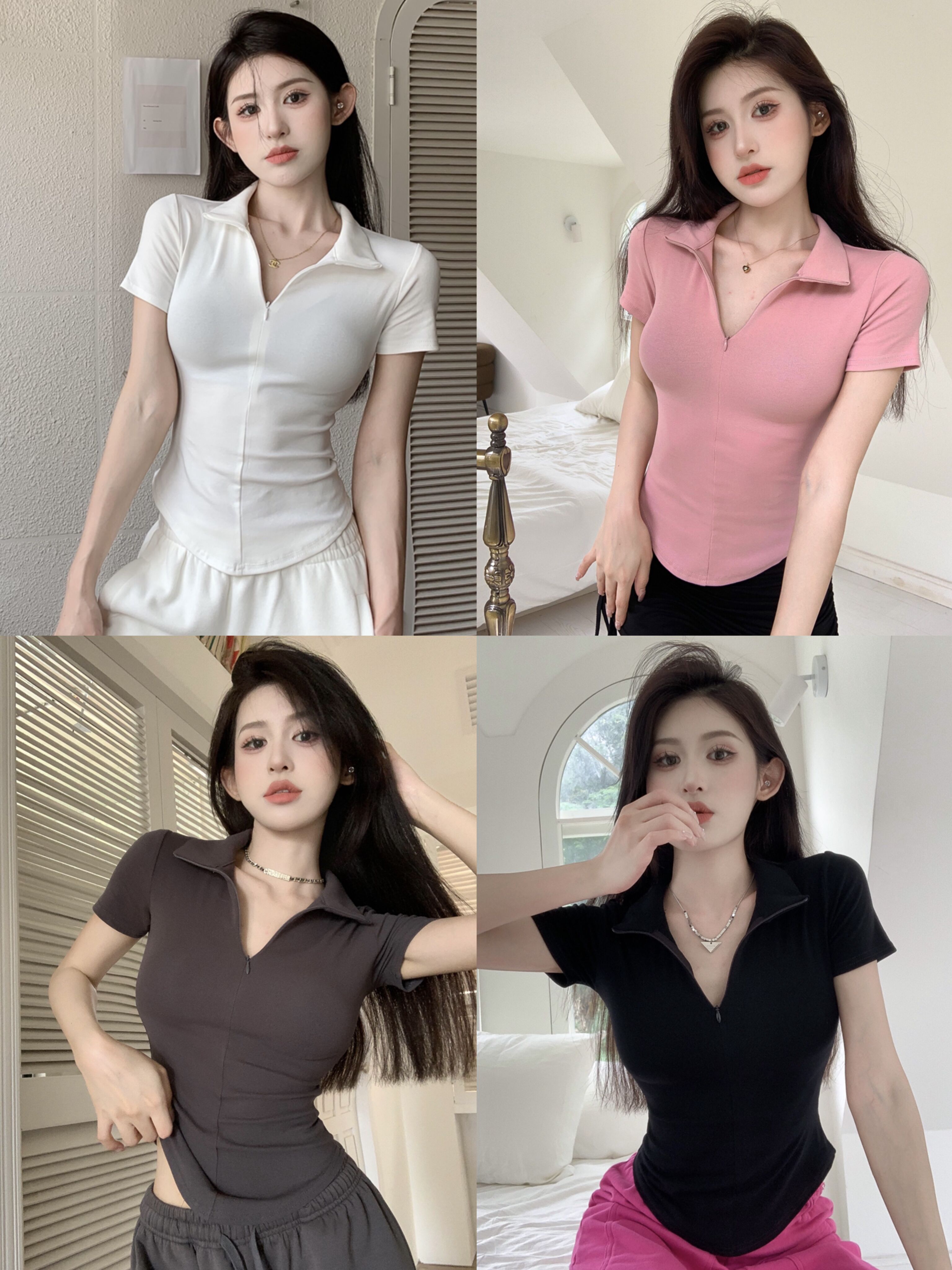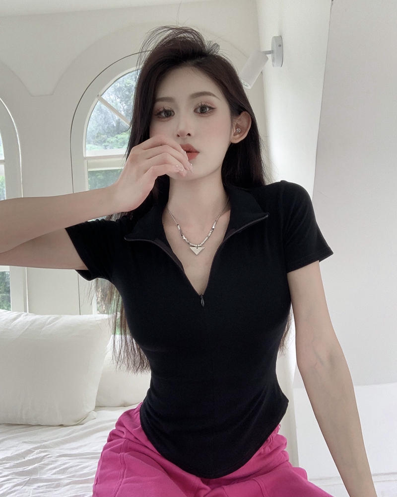 Real 가격의 새로운 여름 핫 걸 스타일 라펠 라벨 지퍼 허리가 손상되는 짧은 짧은 슬리브 티셔츠 스포츠 탑