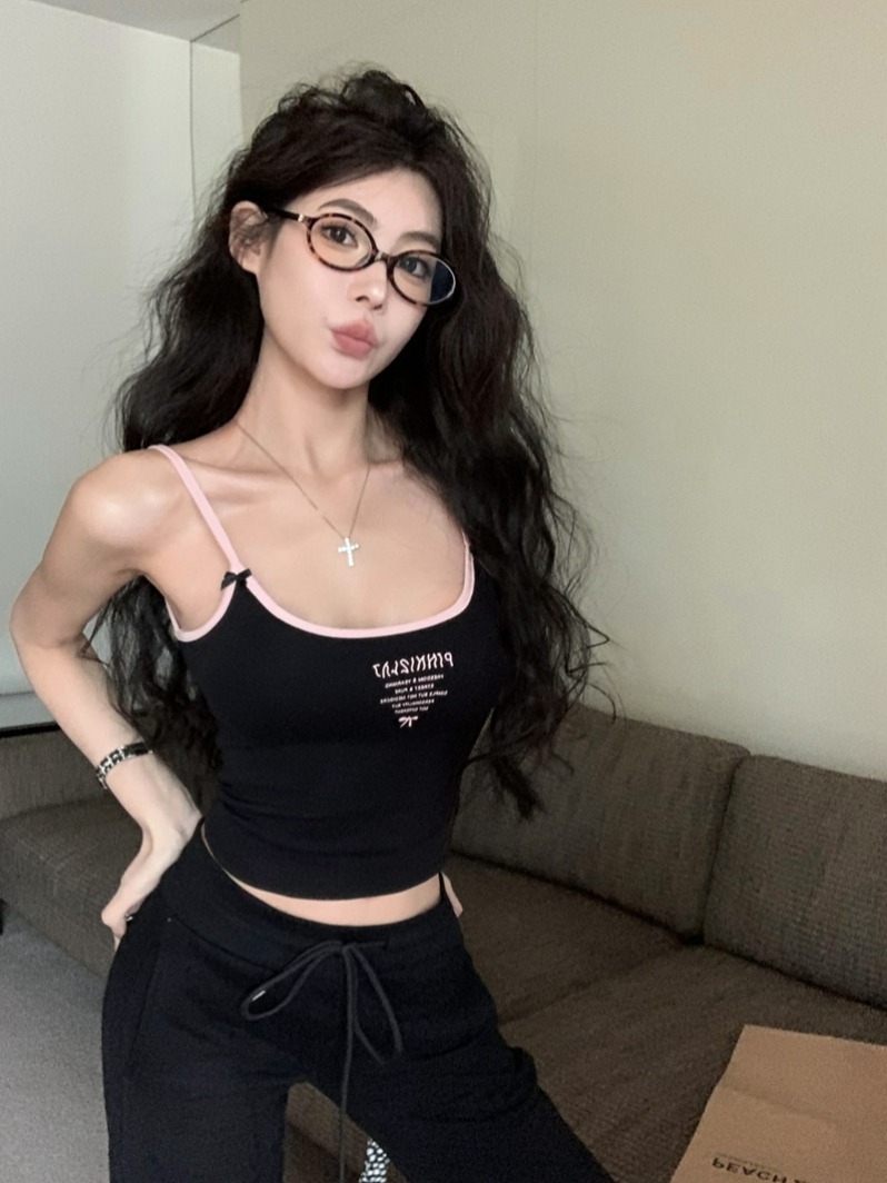 진짜 가격 여름 달콤한 뜨거운 여자 스타일 슬림하고 슬림 활 편지 인쇄 짧은 서스펜더 조끼 상단