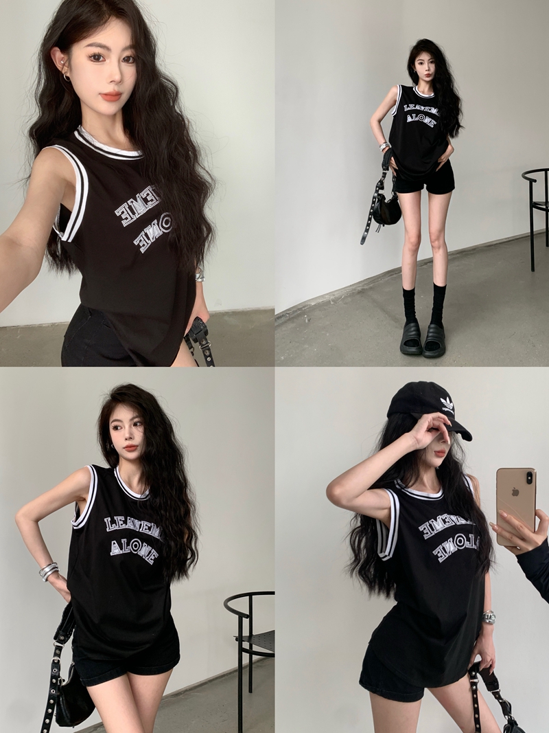 실제 가격 여름 레트로 자수 편지 검은 느슨한 대조적 인 민소매 티셔츠 농구 스포츠 조끼 저지 트렌드