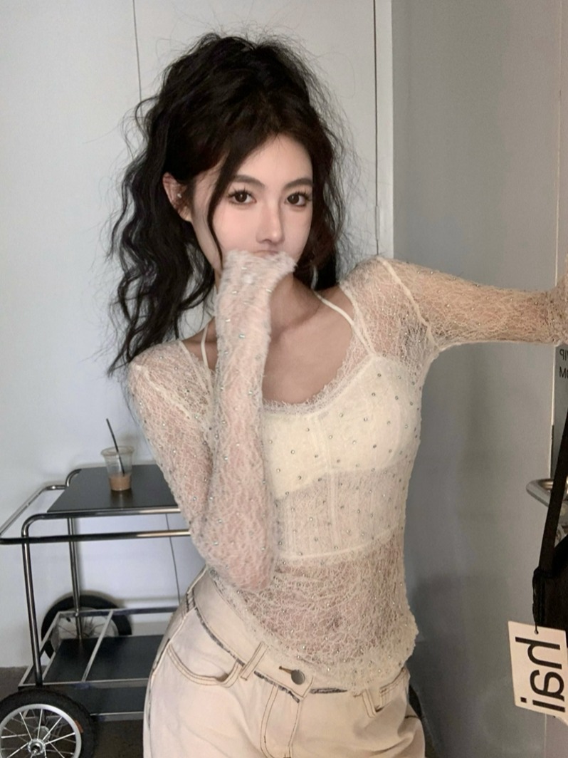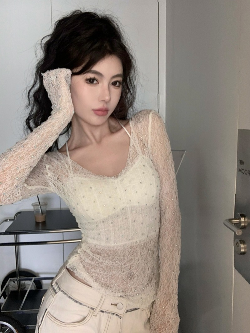 진짜 가격 순수 욕망 프랑스 다이아몬드 세트 흰색 긴팔 레이스 티셔츠를 슬림하고 뜨거운 여자 중공 선 보호 탑처럼 보이게합니다.