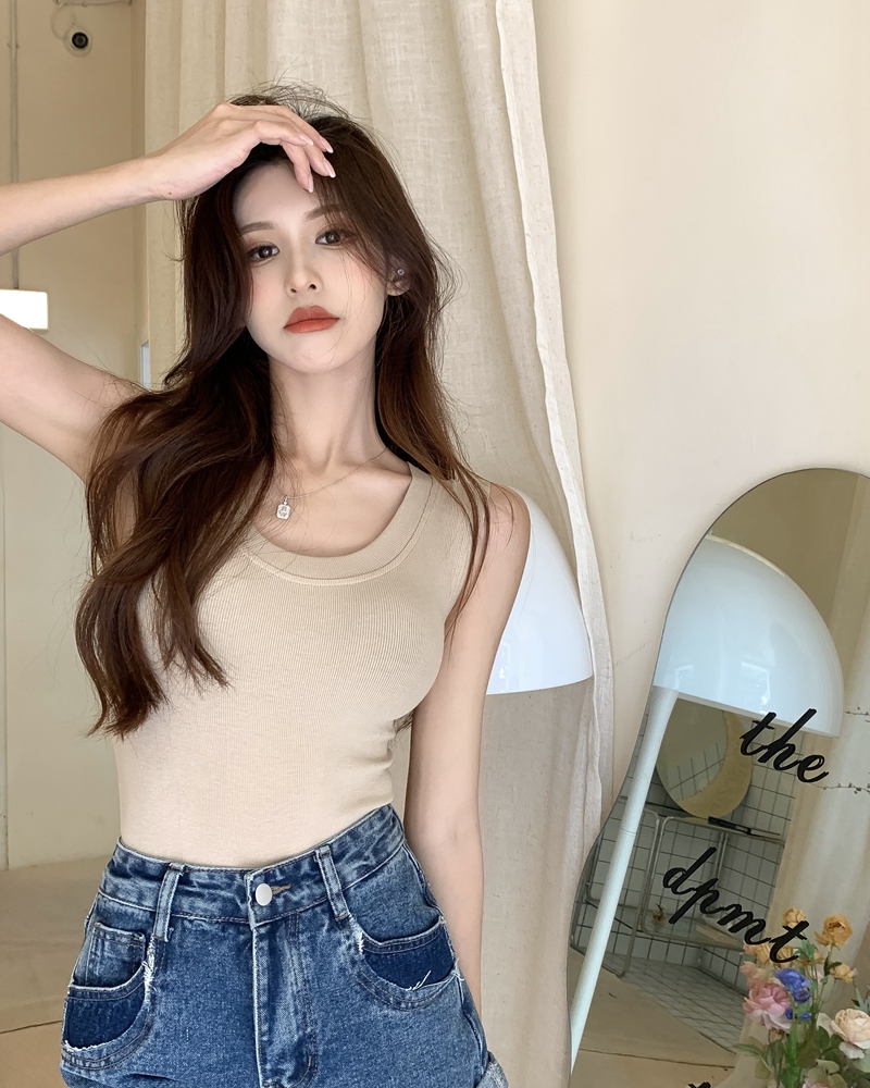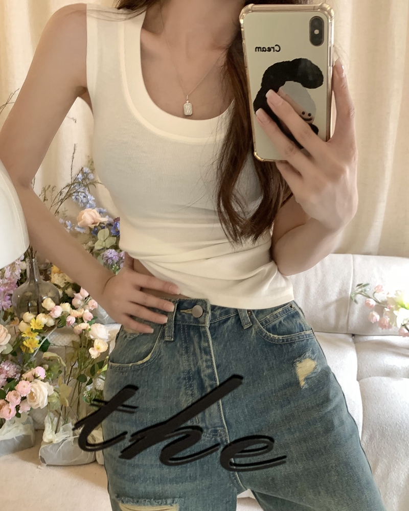 실제 가격 여름 핫 소녀 스타일의 단색 내부 조끼 여성의 다목적 슬림 소매 소매 소매 스레드 티셔츠 ins 상단