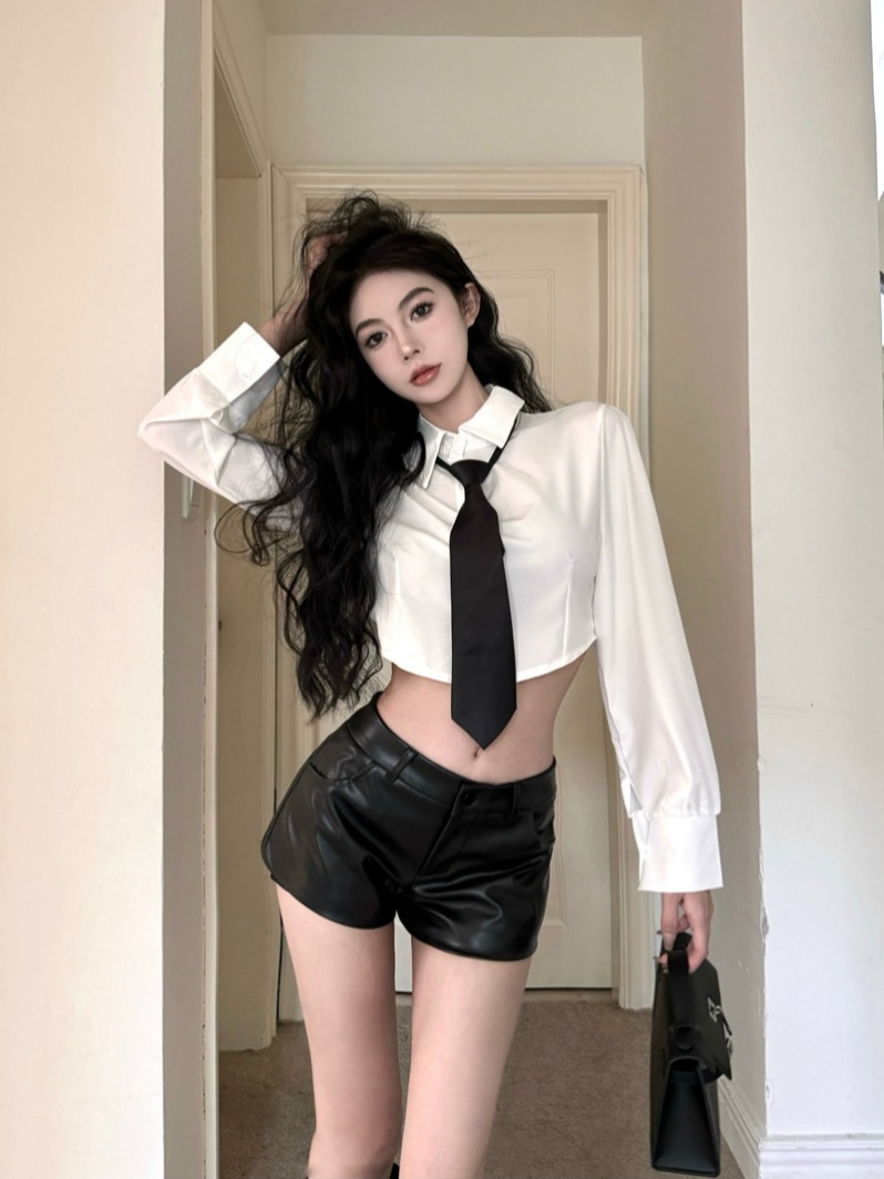 넥타이 레이어링 긴 소매 셔츠가없는 허리 껴안는 봄 짧은 상단을 가진 여성을위한 실제 가격 대학 스타일 흰색 셔츠