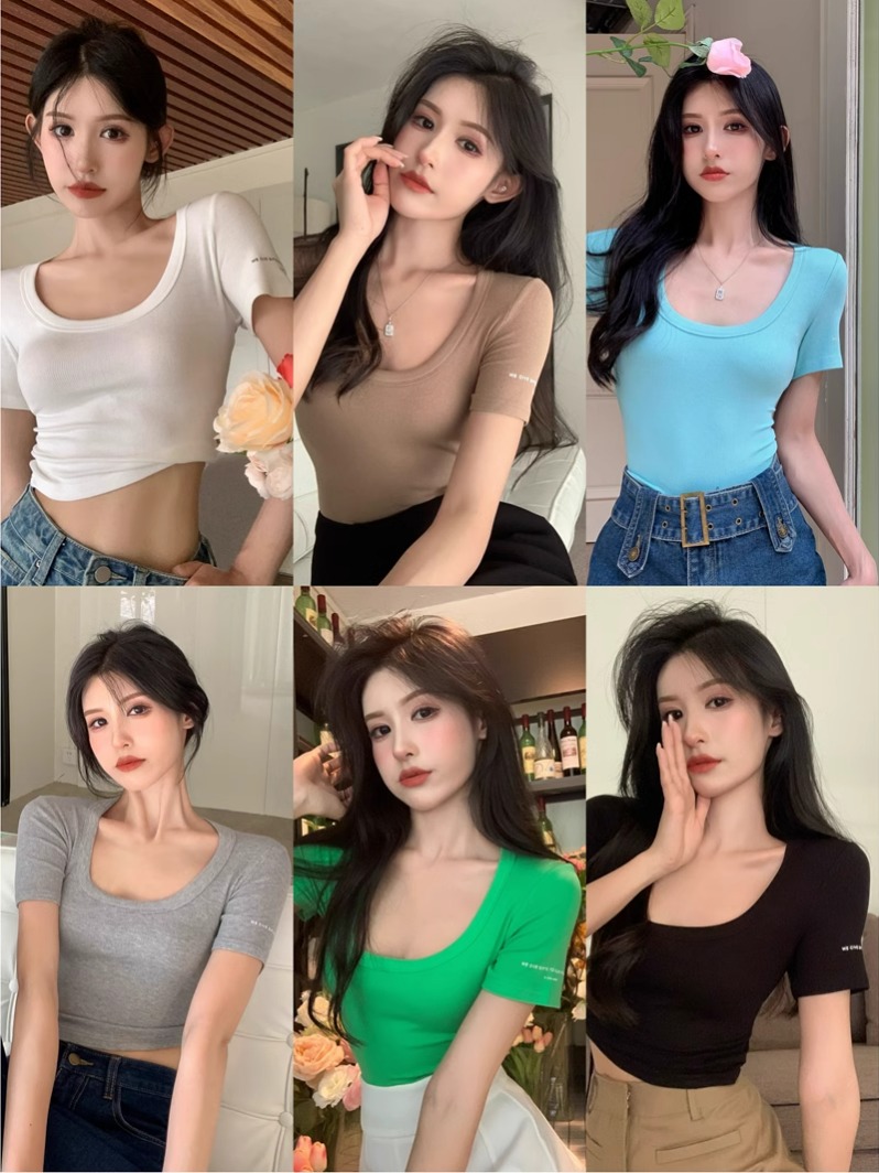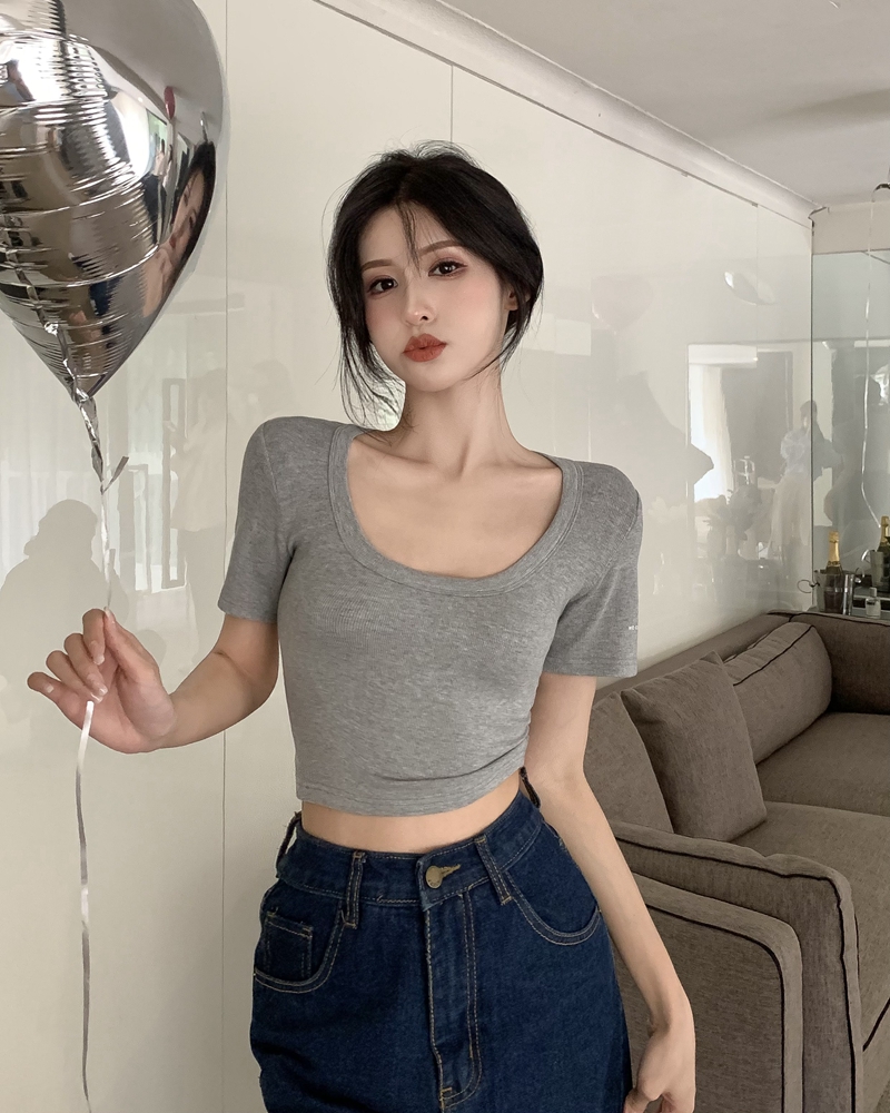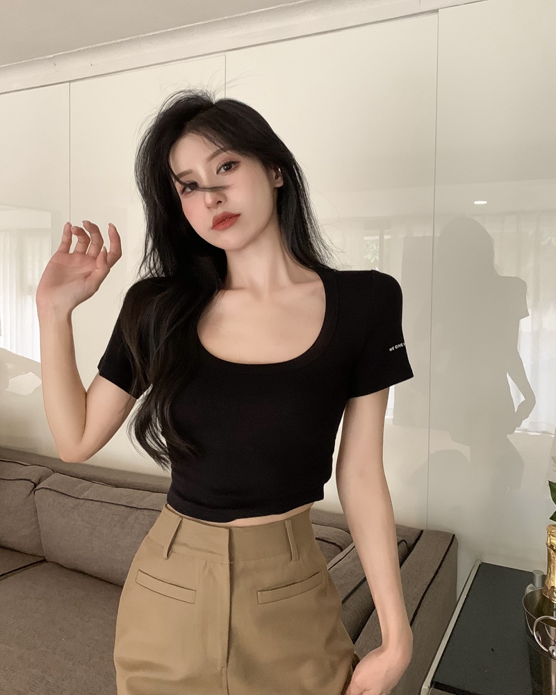 실제 가격의 뜨거운 소녀 스타일 편지 낮은 U-Neck 슬림 탄성 실면 짧은 짧은팔 티셔츠 섹시 배꼽 탑