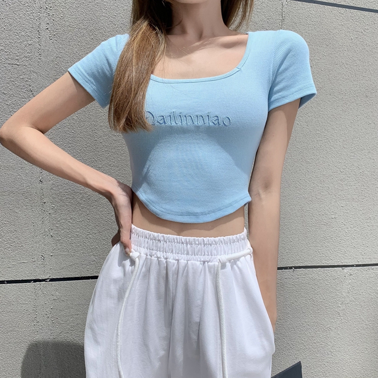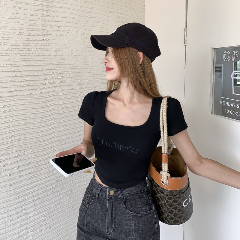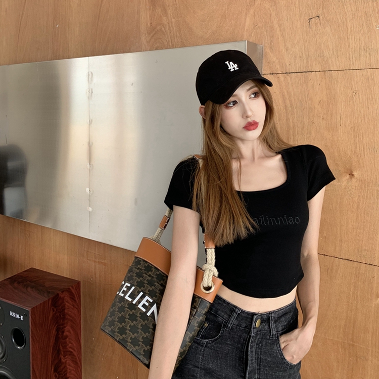 Real 가격의 레트로 레터 슬림베이스 셔츠 스퀘어 칼라 로우 컷 쇄골 단축 티셔츠 배꼽 하이 허리 상단