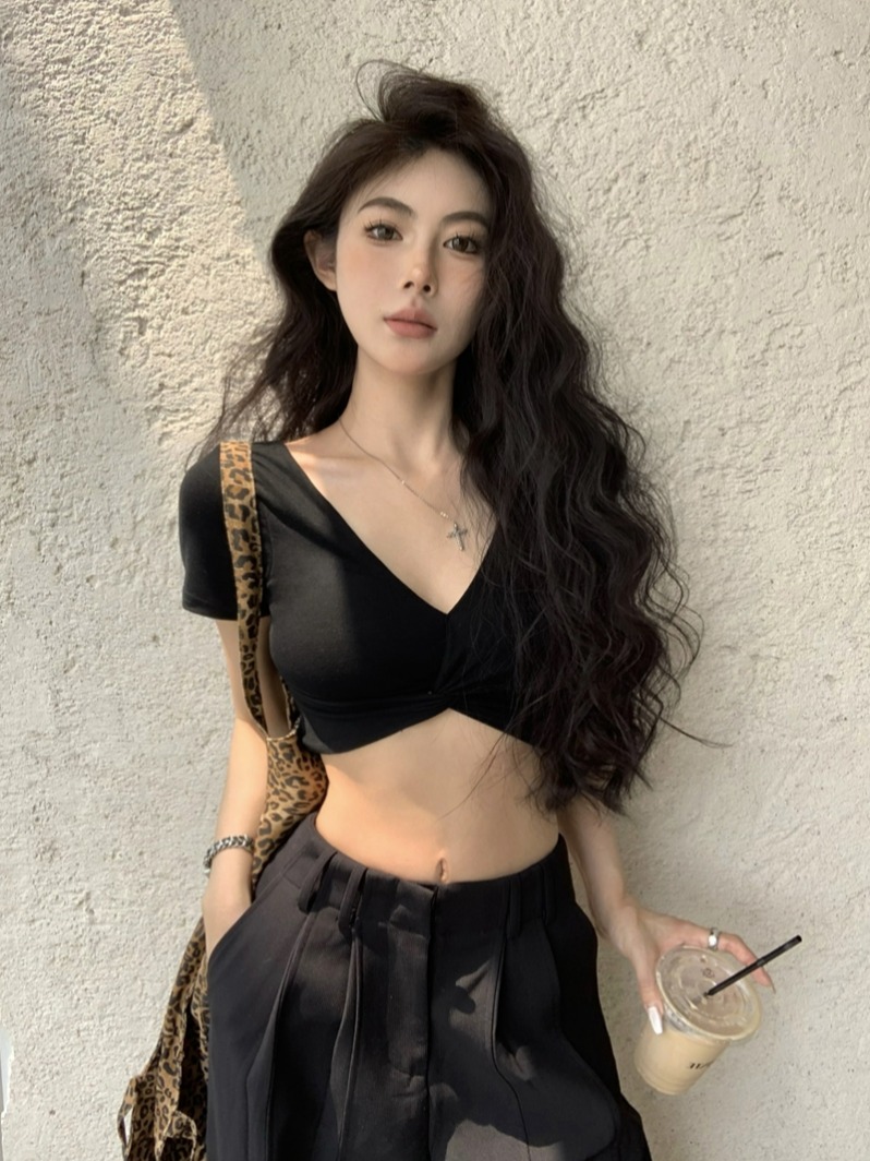 실제 가격 여름 섹시한 핫 걸 스타일 V- 넥 크로스 크로스 가슴 패드 짧은 소매 티셔츠 여성