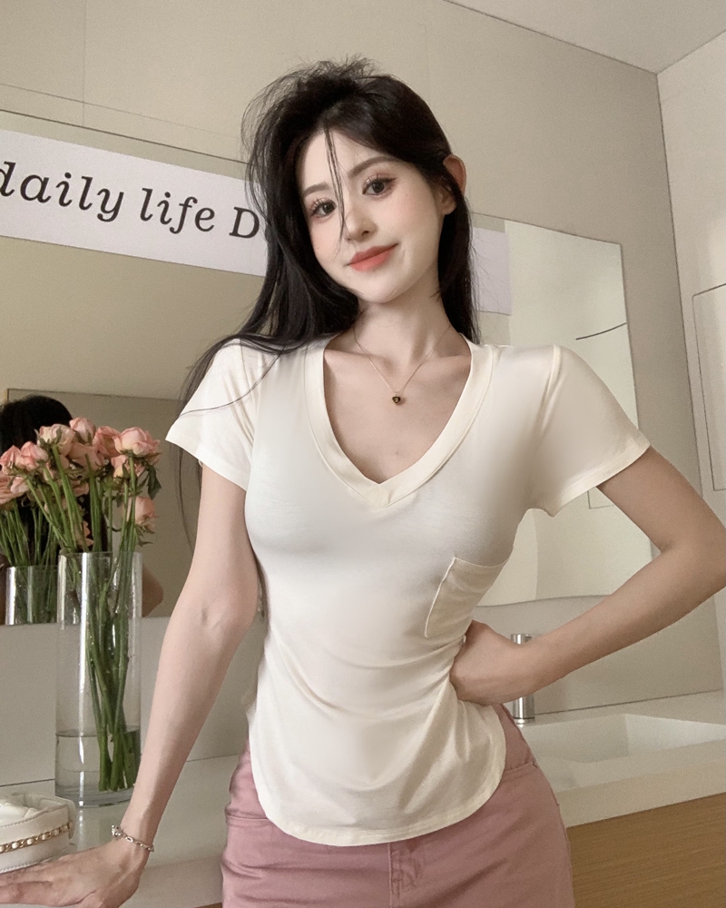 실제 가격 샷과 실제 가격 순수한 섹시한 핫 걸 스타일 드레이프와 슬림하고 슬림 v 넥 포켓 얇은 짧은 슬리브 티셔츠