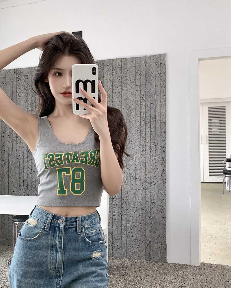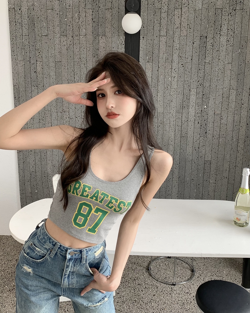 진짜 가격 여름 유럽과 미국인 핫 걸 스타일 편지 인쇄 u-neck 슬림 한 짧은 조끼 INS 배꼽 최고 트렌디