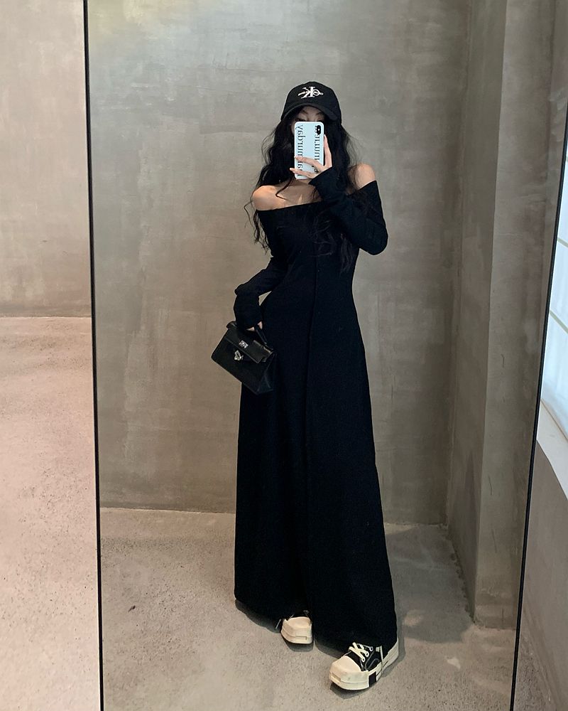 실제 샷, 실제 가격 봄 및 여름 뉴 프랑스 고조용 원산가 디자인 검은 긴팔 니트 드레스