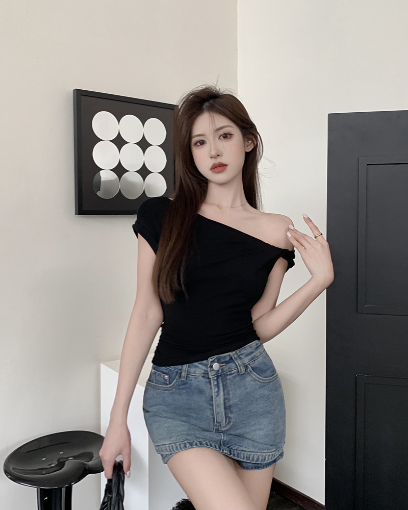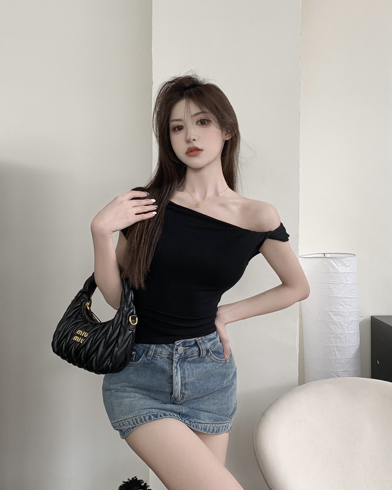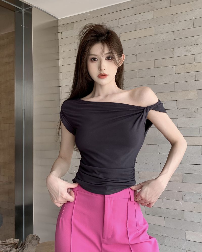 진짜 가격 여름 순수한 섹시한 뜨거운 여자 스타일 디자인 꼬임 꼬리 짧은 슬리브 오프 숄더 티셔츠 원 숄더 탑