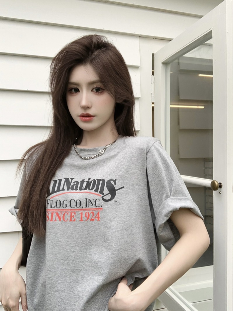 실제 가격 여름 새로운 레트로 레터 인쇄 느슨한 넓은 버전 중간 길이의 짧은 소매 티셔츠 어깨 패드 탑 트렌디