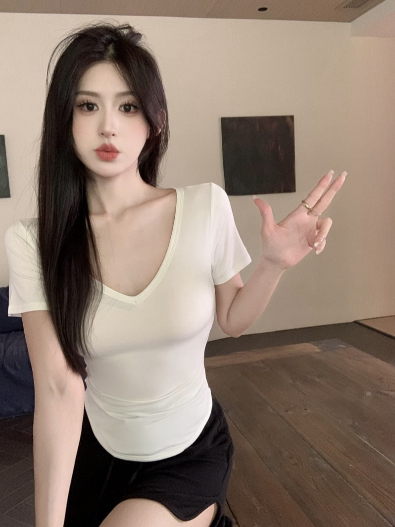 진짜 가격 여름 섹시한 섹시한 여자 Cool Drooping V-Neck 짧은 짧은 슬리브 마스크 티셔츠 모달 탑