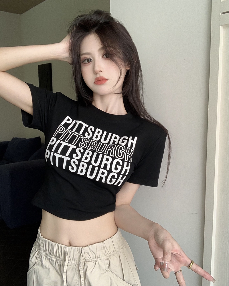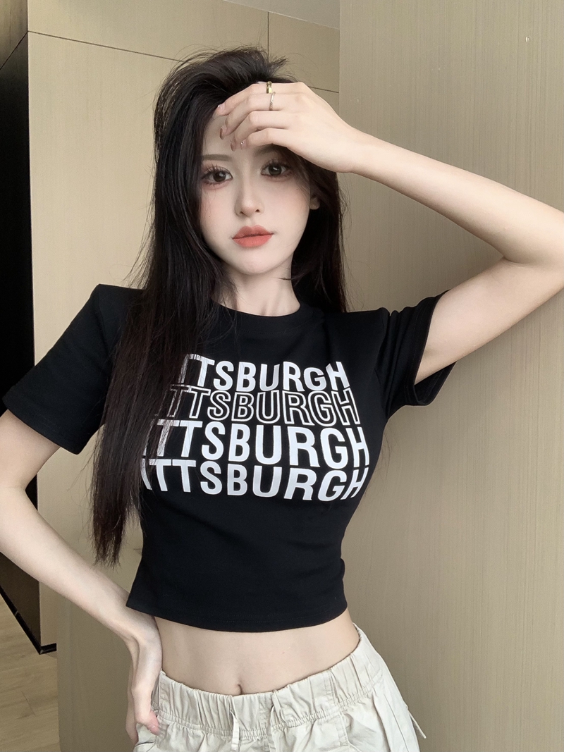 실제 가격 여름 핫 걸 스타일 편지 인쇄 슬림 한 짧은 배꼽 열기 짧은 슬리브 어깨 패드 티셔츠 슬림 상단